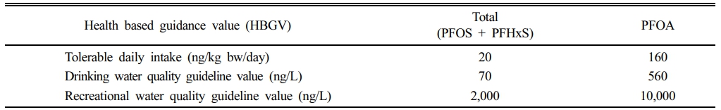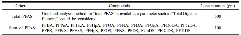 유럽연합(EU)은 2020년 12월 먹는물 수질지침(DWD) 개정안을 확정하여 과불화화합물에 대한 기준치로 PFAS-total과 Sum of PFAS를 도입했다. 각각 PFAS-total 0.5 mg/L, Sum of PFAS 0.1 mg/L의 기준치를 설정하였다(Table 7) (European Parliament and Council, 2020).