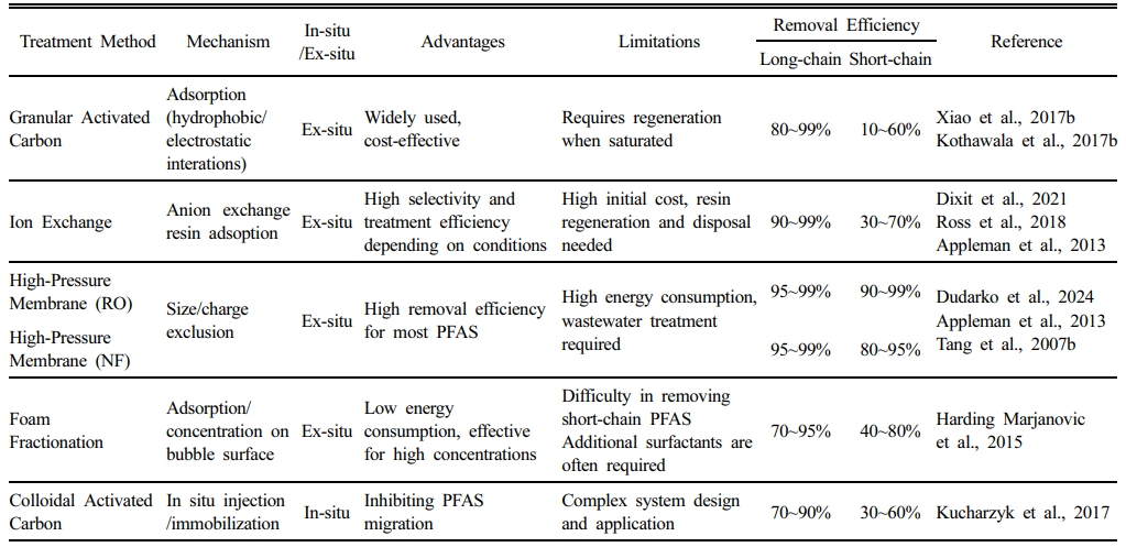 지하수 중 과불화화합물 현장정화방법으로 입상활성탄(GAC; Granular Activated Carbon), 이온교환(IX; Ion exchange), 고압멤브레인, 거품분리, 콜로이드활성탄(CAC; Colloidal Activated Carbon)이 주로 활용 및 연구되고 있다(Table 9)(ITRC, 2025).