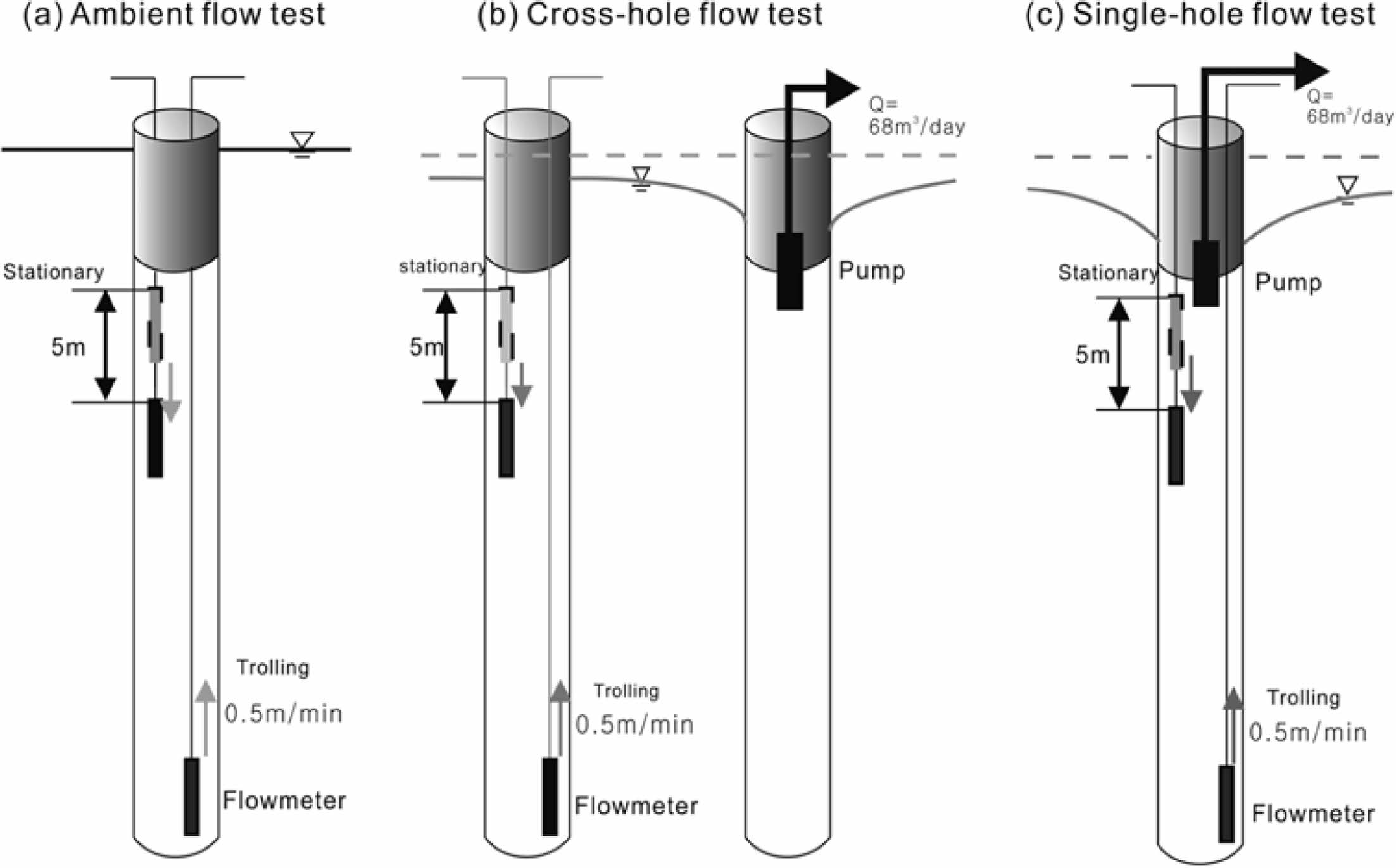 Fig. 3 Conceptual diagrams of single-hole and cross-hole flowmeter tests (Jang et al., 2007). |