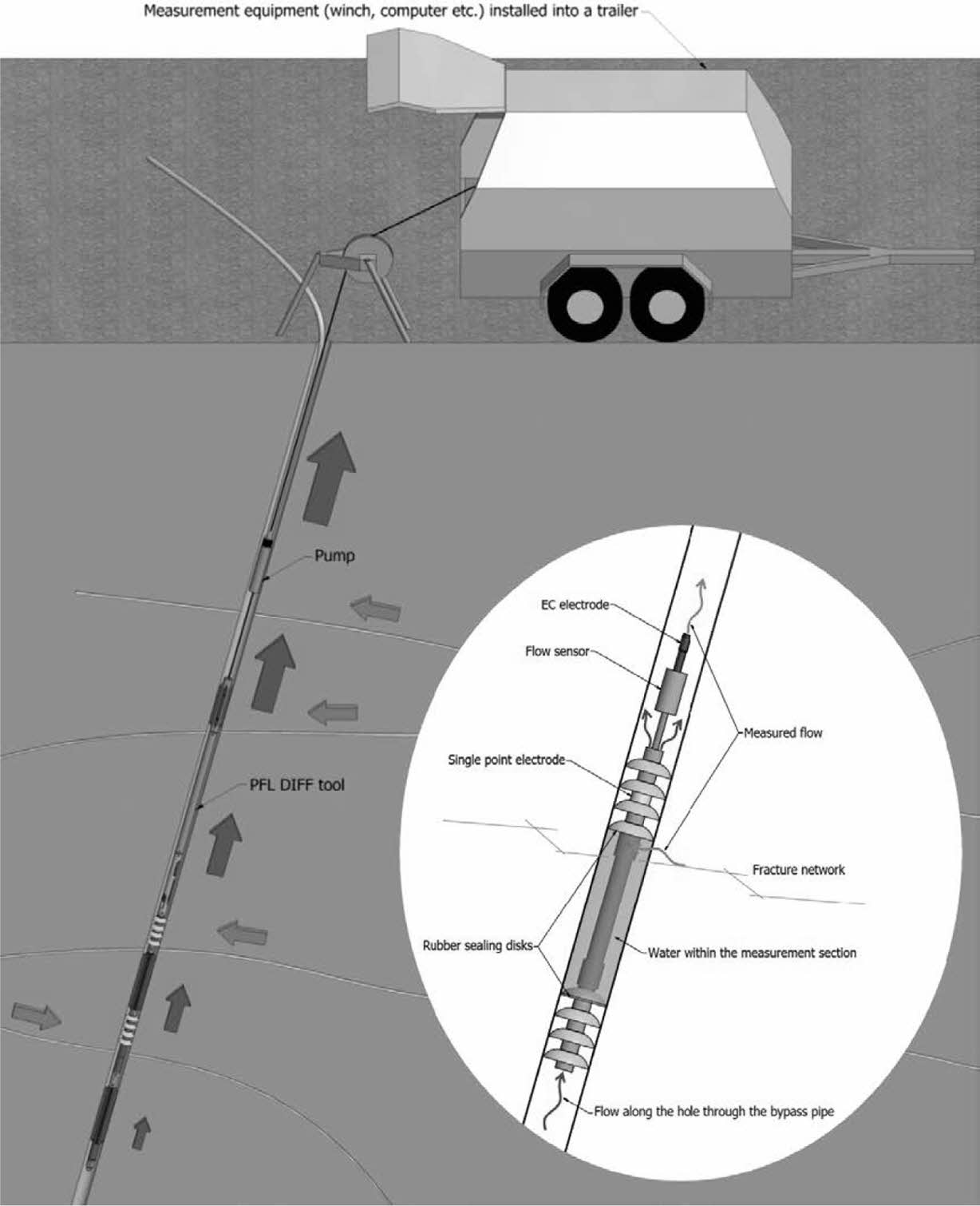 Fig. 11에 도시된 바와 같이 핀란드나 스웨덴에서 사용된 PFL DIFF 방식은 이전 Pillet(1993)의 방식에 비해 2가지 점에서 차별성을 가진다. 첫째는 특정 심도에서의 유량 측정 방법인데, Pillet(1993)의 방법에서 측정되는 공내 유량은 누적 유량의 개념인데 반해 PFL DIFF 방식에서의 유량은 측정 대상 구간의 유량이다. 따라서 PFL DIFF 방식에서는 수직적 유량의 변화가 직접 측정되지만, 상향식의 Paillet(1993)의 방식에서는 측정 유량에서 직전 유량을 빼주어야 대상심도에서의 유량이 얻어진다. 둘째는 고무로 된 차폐 디스크(rubber sealing disc)의 개수 역시 차이가 나는데, Paillet(1993)의 방식에서는 유량 측정 하단부에 어느 정도 유연성을 가진 고무 스커트를 1매 설치하여 측정 외 구간으로의 지하수 흐름을 차단하고자 하는 반면에 PFL DIFF 방식에서는 측정 대상 구간 상하부에 각각 4매의 고무로된 차폐 디스크를 설치하여 유량 측정상의 오차를 줄이고자 하였다. 첫 번째의 차이는 유량 측정값만 정확하다면 두 방법 상의 정량적 차이를 유발하지 않으나, 두 번째 차폐 방식의 차이는 상대적으로 큰 차이를 만들 수 있다. 통상적으로 균열암반매질에서의 시추공 공벽은 균열이나 강도 등에 따라 외형상의 차이, 특히 공의 구경 상에서 차이를 보이게 되는 데, 1매의 디스크만을 사용하는 경우 균열 등에 의해 공경 확장이 일어난 경우 유량계를 통하지 않고 우회하는 지하수의 흐름이 필연적으로 발생하게 되므로, 해당 구간에서의 유량 측정값은 큰 오차를 가지게 되거나 해당 구간은 피하여야 한다. 하지만 여러겹의 차폐용 디스크를 사용하는 경우 설사 하나 혹은 두 개의 차폐 디스크가 확대된 공경에 의해 지하수의 우회를 허용하더라도 다른 디스크에 의해 차단될 수 있기 때문에 측정상의 오차가 현격히 줄어들게 된다. 이러한 차이는 공내 유량 측정 시 수직적 해상도에 직접적으로 영향을 줄 수 있다. 즉, 국내에서 지금까지 이용된 공내 유량 측정 방법은 현재 핀란드나 스웨덴에서 사용되고 있는 방법의 하위 호환 방법이라는 것이다. 이와 함께 공내 투수성 균열 혹은 균열대에 대한 정량적 분석 방법과 다중심도 관측정의 설계 및 설치라는 과정이 통합적으로 진행된 경험이 없다는 점은 자체적인 기술적 경험의 완성도를 떨어뜨리고 있다.