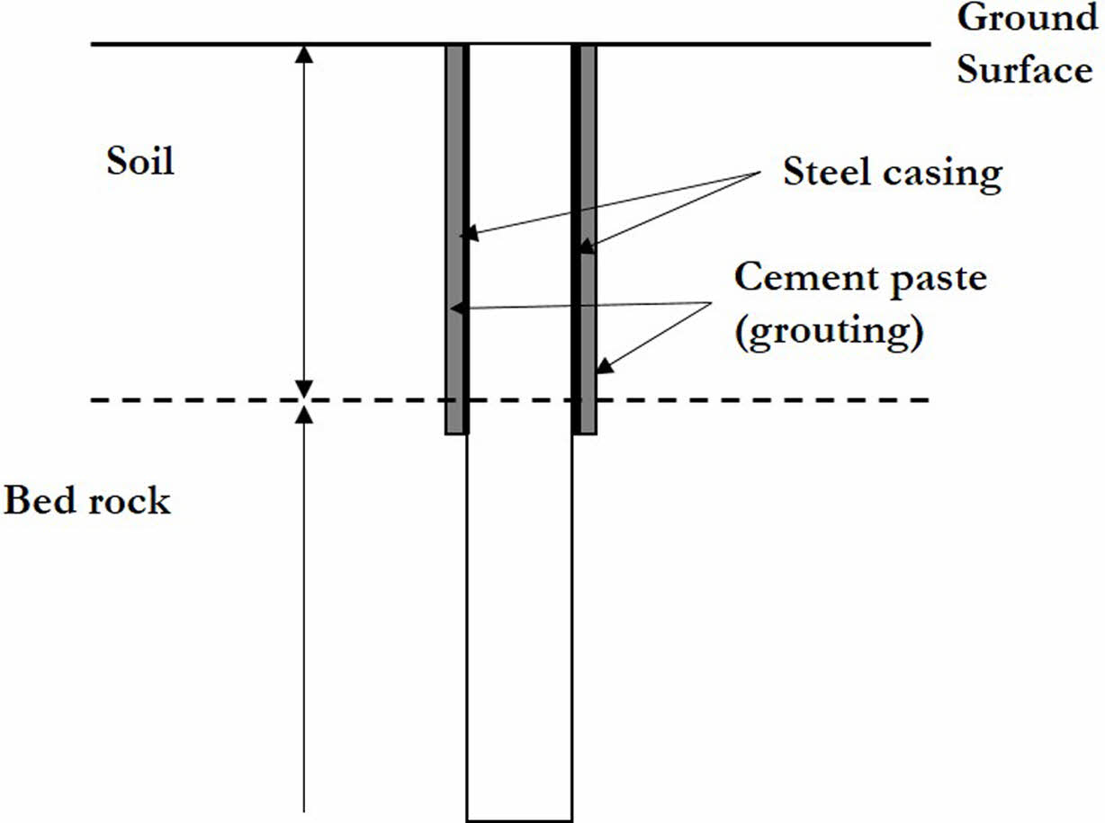 단일 구간의 측정은 주로 지표 부근의 토양층이나 폐기물 처분장 심도와 직접적인 연결성이 없다고 판단되는 상부 기반암의 지하수 모니터링에 사용되는 것이 합리적이다. 비록 본 소단락의 제목에서 “관측정”이라는 명칭을 사용하고 있으나, 토양층의 경우 토양 오거(soil auger) 등을 이용한 간이 굴착 방법을 이용하여 천공된 튜브나 파이프를 심는 형식의 관측정이라도 크게 문제될 것은 없다고 보여진다. 향후 해외 사례에서 언급되겠지만, 핀란드 POSIVA의 Olkiluoto 주변 지역에는 47개 지점의 토양층에 심도별로 천공된 튜브를 설치, 모니터링을 진행하고 있다 (Vaittinen et al., 2024). 다만, 이 경우 천공된 구간을 통해 토양이 관측 튜브로 유입되지 않도록 조치하여야 한다. 다만, 상부 기반암 구간의 관측정은 굴착 작업을 통해 설치하되, 상부 토양층의 지하수가 관측정으로 직접 유입되지 못하도록 토양층 구간은 케이싱이나 그라우팅 등을 통하여 차단하여야 하며, 관측 구간은 공벽의 유지에 문제가 없으면 나공 (open hole) 상태를 유지한다(Fig. 5).