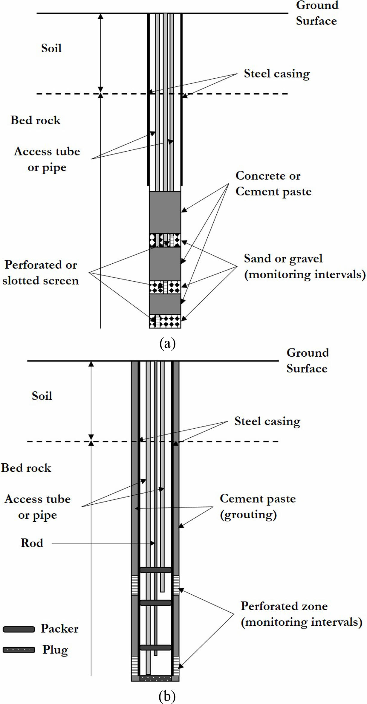 Fig. 6 Conceptual designs of a permanent multi-level monitoring well: (a) the multiple completion well, (b) the single completion well. |