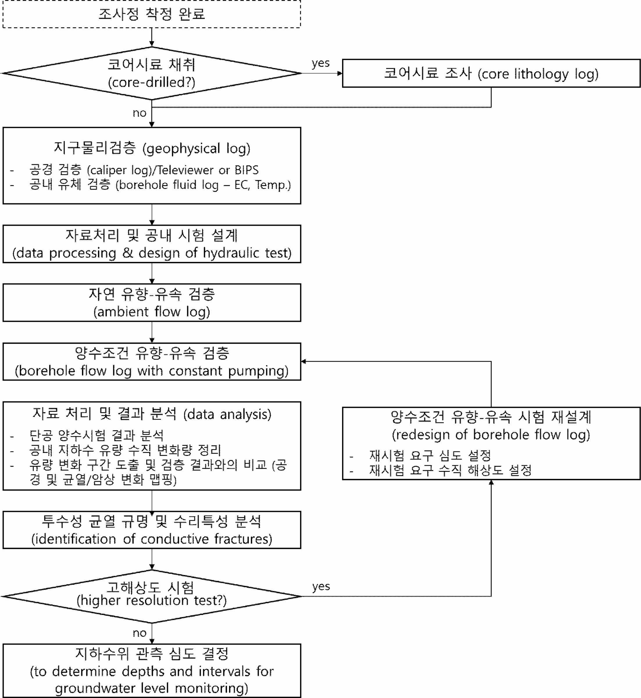 앞서 결정질 암반매질에서 적용될 수 있는 지하수위 관측공에 대해 관측정의 설계된 형태에 따라 살펴보았다. 하지만 관측공의 설치를 위해서는 관측 심도에 대한 결정이 우선되어야 한다. 본 절에서 언급될 다중심도 지하수위 관측정은 설계안에서 설명한 내용 중 4.2와 4.3절에 해당하는 관측정이다. 여기서 서술하고자 하는 내용은 관측정의 굴착이 완료된 이후부터 관측 심도를 결정하기 위한 일련의 조사 절차를 순서에 따라 우선 개괄하고 이 후 적용되는 각 조사 단계별로 조사 방법에 관한 개요와 이를 통해 도출되는 관측정 설계 인자에 관한 것이다. 기본적인 조사 절차는 Fig. 8에 제시된 바와 같다.