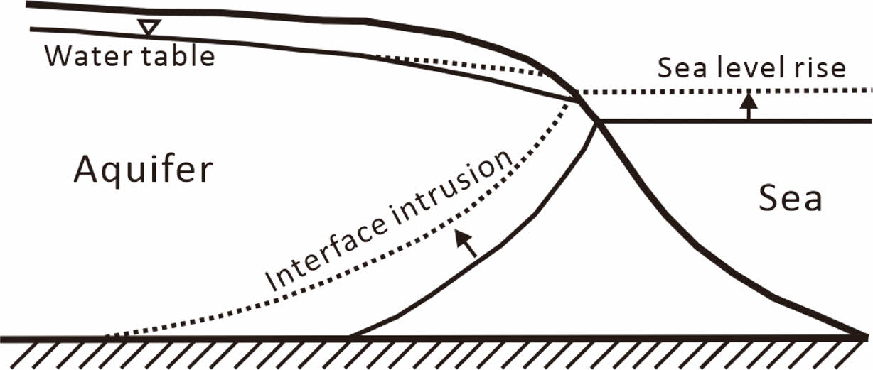일반적으로 기후변화에 의한 지구온난화로 해수면이 상승하게 되면 해안지역의 지하수위도 상승한다. 이에 따라 대수층에 형성되는 담염수 경계면이 내륙방향으로 이동하게 되며, 결과적으로 대수층을 통한 해수침투 범위가 내륙지역까지 확장하게 된다(Sherif and Singh, 1999). 또한 해안 대수층으로부터 지하수 과잉 양수도 해수침투의 주요한 원인으로 지목된다(Sreekanth and Datta, 2010).