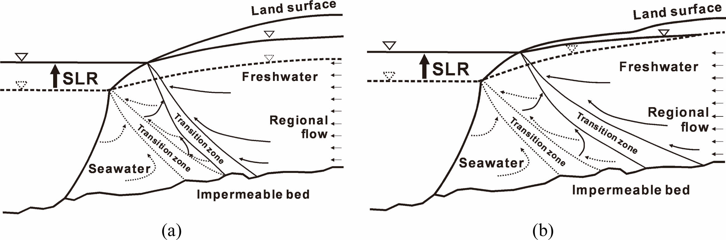 해수면 상승이 대수층을 통한 해수침투에 미치는 영향을 평가하기 위하여 개념적 또는 수학적 모델 등 다양한 접근 방식이 이용되었다. 일반적으로 해수면 상승은 해안변의 지하수위를 상승시키지만, 상승 속도가 느려 효과가 내륙쪽으로 갈수록 적어지게 된다(Sherif and Singh, 1999)(Fig. 2). 따라서 지하수위의 기울기가 감소하므로 담염수 경계면의 확장으로 인한 해수침투가 발생하게 된다(Sherif and Singh, 1999; Werner and Simmons, 2009). 결과적으로 해안변에서는 지하수위가 상승하기 때문에 담수체의 두께가 약간 감소하는 반면 내륙쪽에서는 지하수위 상승폭이 작아 상대적으로 경계면이 내륙쪽으로 깊게 형성된다. 따라서 완만한 동수구배를 갖는 해안 대수층이 기후변화에 따른 해수면 상승에 더욱 취약한 환경에 놓이게 된다.