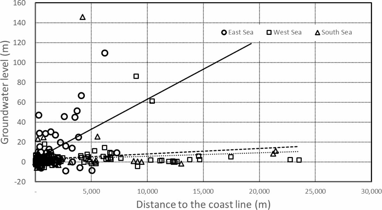 Fig. 4 Groundwater level distribution with distance to the coast line in seawater intrusion monitoring network. Solid lines, dotted lines, and dashed line indicate the trend lines of data for East Sea, West Sea, and South Sea, respectively. |