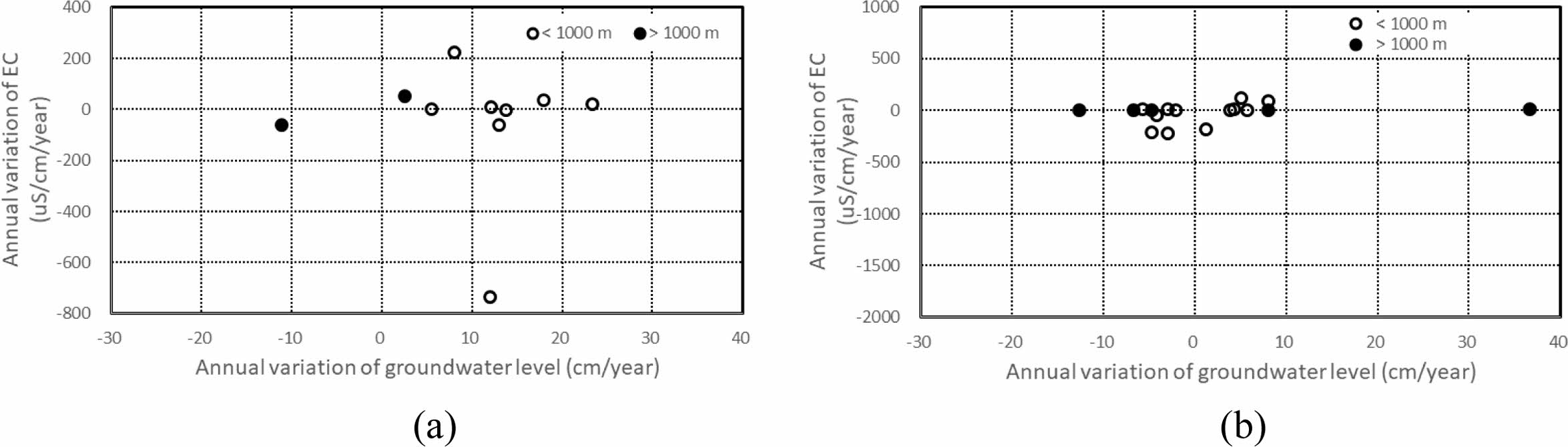 Fig. 7 Distribution of annual variation of electrical conductivity to annual variation of groundwater level based on 1 km from the coast line on West Sea (a) and East Sea (b) for the analyzed wells (2018~2024). |
