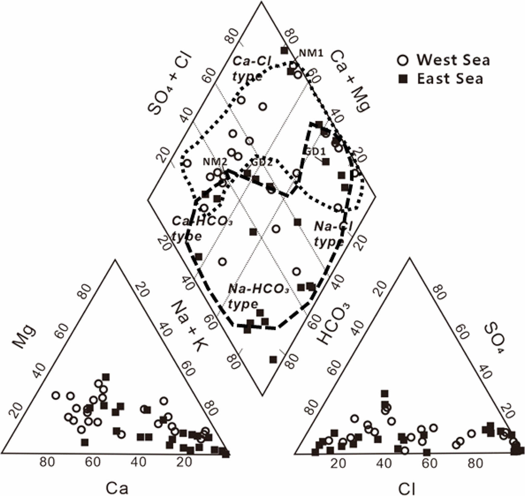 Fig. 9 Piper plots of groundwater chemistry for 48 monitoring wells in 2024. Dotted and dashed area indicate well group located on West Sea and East Sea, respectively |