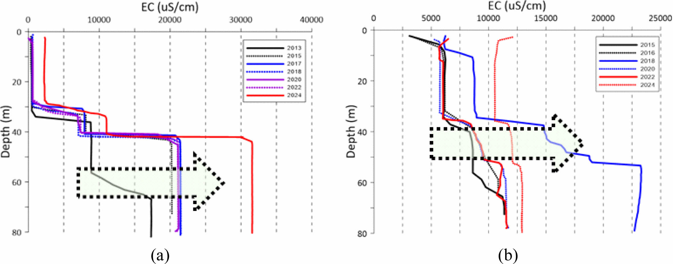 Fig. 15 Electrical conductivity profiling at GD2 (a) and GD3 (b) monitoring wells during 12 years (2013-2024). Dotted arrows indicate the movement of transition zone between saline groundwater regime and fresh groundwater regime. |