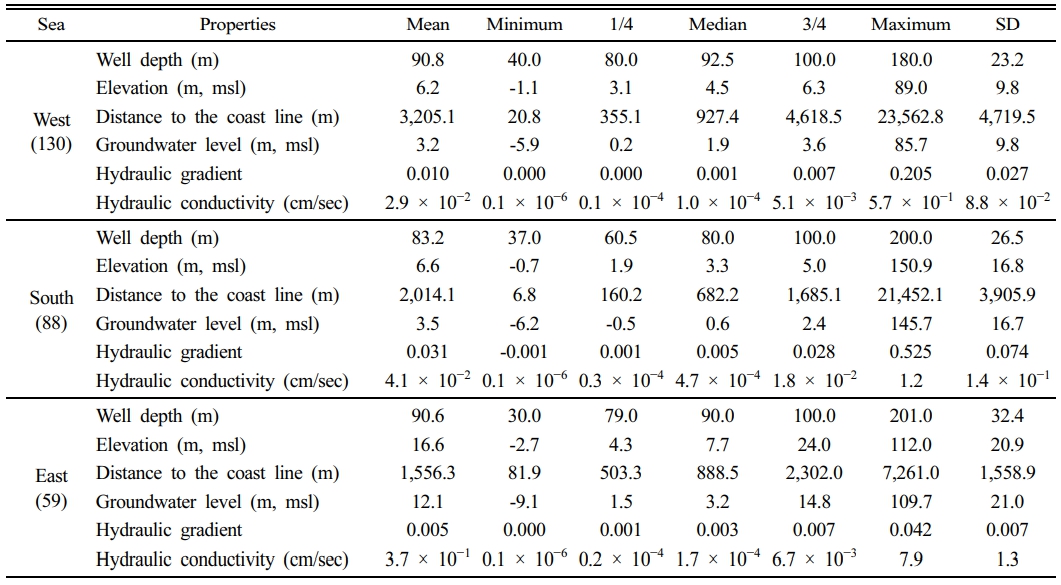 우리나라에는 277개(서해안 130, 남해안 88, 동해안 59)의 해수침투 관측망이 운영 중이다(Table 1). 해안선으로부터 관측공까지 거리는 동해안에서 평균 1,556 m로 가장 가깝고, 서해안에서 평균 3,205 m로 가장 먼 것으로 나타났다. 관측공이 위치한 해발고도는 지형 경사가 완만한 서해안과 남해안에서 각각 6.2 m와 6.5 m인 반면, 지형 경사가 급한 동해안에서는 16.6 m로 약 10 m 높게 나타났다. 관측공의 심도는 모든 해안에서 평균 83.2~90.8 m 유사하게 나타났지만, 지하수위는 해발고도를 기준으로 서해안과 남해안에서 각각 3.2 m와 3.5 m인 반면 동해안에서는 12.1 m로 높게 나타났다. 해안선까지 거리에 따른 관측공의 지하수위 분포는 거리가 증가함에 따라 동해안에서 가장 크게 증가하며, 서해안에서는 상대적으로 증가폭이 적게 나타났다(Fig. 4). 수리전도도는 서해안과 남해안에서 평균 2.9~4.1×10-2 cm/sec인 반면, 동해안에서는 상대적으로 높은 평균 3.7×10-1 cm/sec로 나타났다. 관측공의 지하수위와 해안선까지 거리로 계산된 해안별 동수구배 평균값은 서해안과 동해안에서 각각 0.010과 0.005으로 유사하지만, 남해안에서는 0.031로 높게 나타났다.