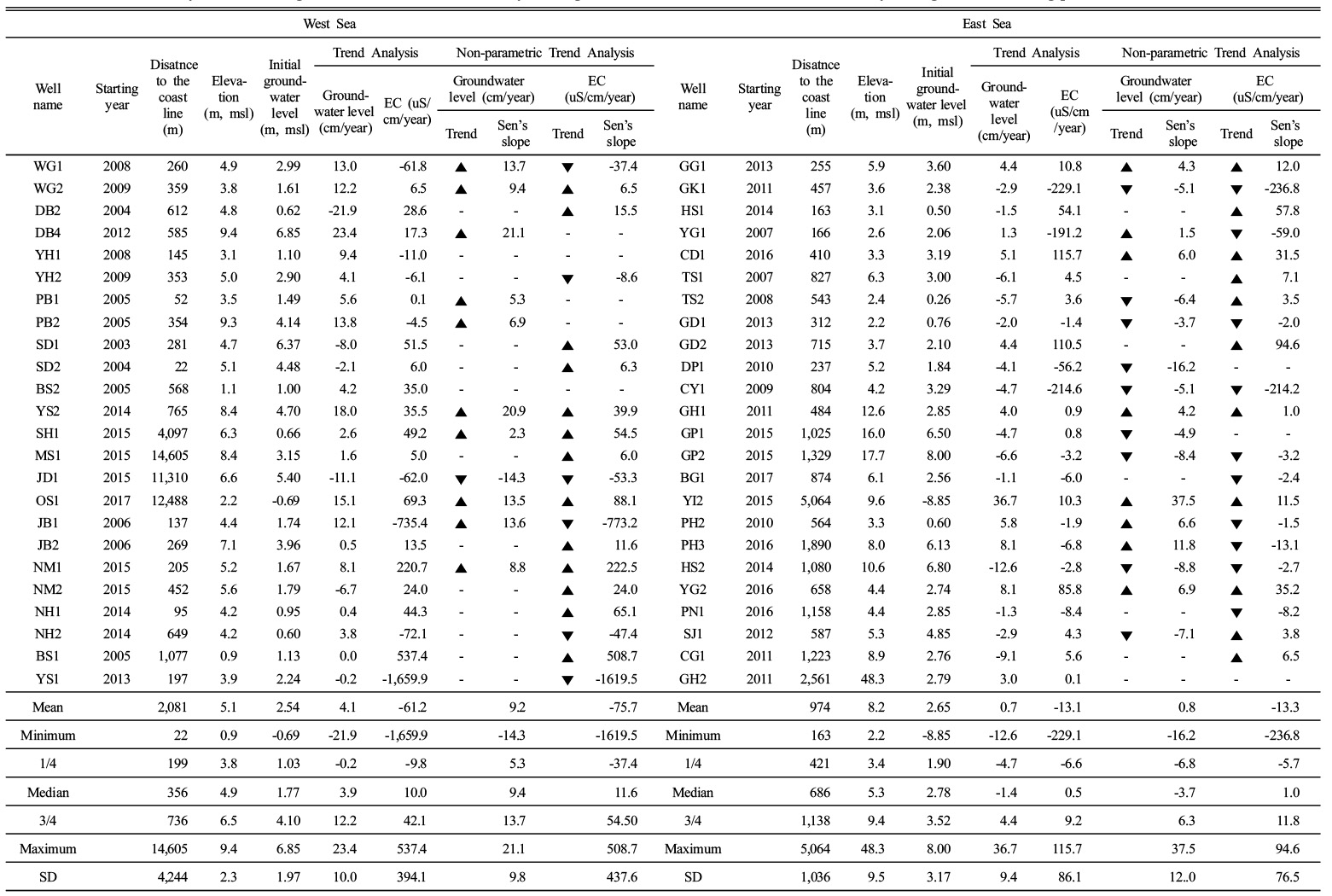이 연구에서는 관측공의 평균 해발고도, 지하수위 분포, 수리전도도, 동수구배 등을 기초로, 동해안과 서해안의 관측공을 대상으로 대수층을 통한 해수침투 영향을 평가하였다. 이를 위하여 전체 관측공 중 동해안과 서해안에서 7년 이상(2018~2024년) 관측자료가 축적된 48개소(각 24공) 해수침투 관측공을 대상으로, 해수면 상승을 포함한 다양한 요인에 의한 해수침투 현상의 시·공간적 특성을 평가하였다(Table 2)(Fig. 5). 이때 각 관측공의 연간 지하수위 및 전기전도도의 변화율에 대하여 95% 신뢰구간에서 Mann-Kendall 검정 통계량 및 Sen’s slope 계산값을 활용한 변동 경향 파악을 목적으로, 동해안과 서해안에서 각각 17개와 11개 관측공을 선정하여 분석에 이용하였다.