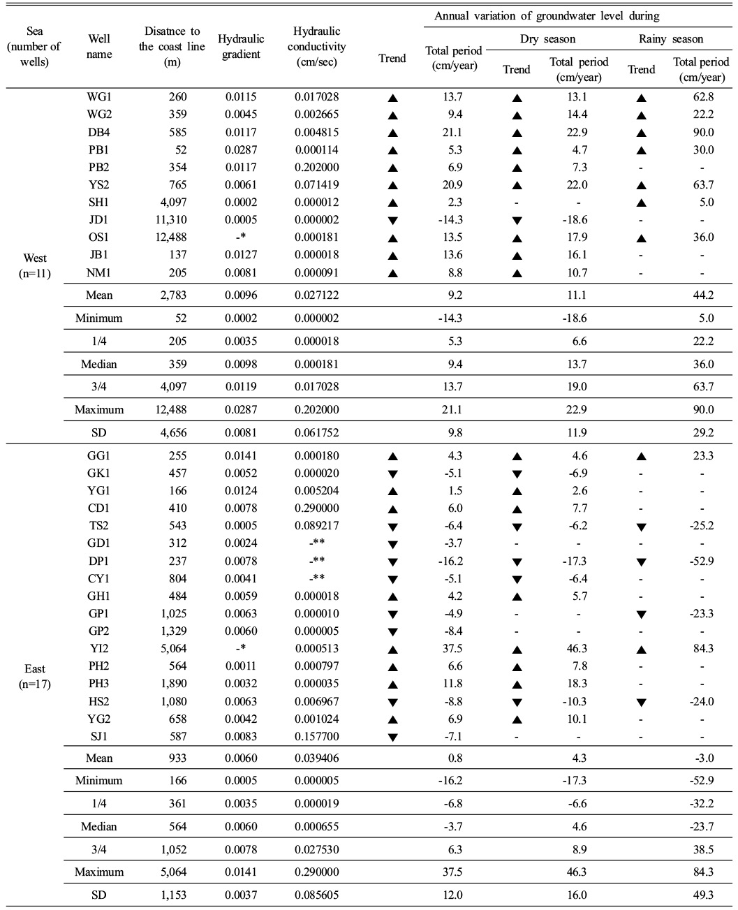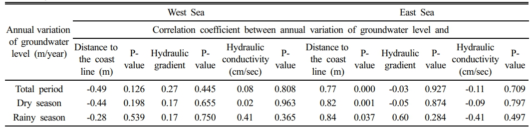 이러한 결과들을 토대로 3가지 기간(전체기간, 갈수기, 풍수기)의 연평균 지하수위 변화율과 3가지 요인(관측공으로부터 해안선까지 거리, 동수구배, 수리전도도)에 대하여 각각 상관분석을 수행하였다(Table 4).