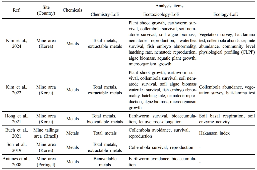 폐광부지를 대상으로 한 연구사례는 7건 확인되었다(Table 2). Antunes et al.(2008)는 우라늄광산 부지를 대상으로 4개 지점을 선정하여 토양분석과 현장평가를 수행하였다. 토양에서 고농도의 중금속오염에 따른 지렁이(Eisenia andrei) 회피반응과 높은 수준의 체내축적이 확인되었다. 결과를 통해 지렁이평가 기반의 Ecotox-LoE 산출은 적절하나, Eco-LoE 적용 필요성을 제시하였다. Son et al.(2015)은 폐금속광산 부지 10곳을 대상으로 TierI의 생태위해성평가를 수행하였다. 토양의 중금속 농도과 추출가능 농도를 평가하였으며, 톡토기(Paronychiurus kimi)의 생식률을 평가하였다. 통합위해도 결과를 기반으로 오염순위를 선정하였으나, Chem-LoE, Ecotox-LoE의 높은 표준편차로 다음 단계의 평가가 필요함을 제시하였다. Buch et al.(2021)는 댐 붕괴로 폐광으로 덮인 지역에 대하여 시간간격을 두고 토양을 채취하여 중금속 농도를 측정하였다. 톡토기(Proisotoma minuta)의 생존율, 생식률, 회피평가를 수행하였으며, Ecotox-LoE를 기반으로 잠재적 생태학적 영향을 평가하였다. 해당 연구는 Chem-LoE 결과 보완을 위해 Ecotox-LoE의 필요성을 제시하였으며, 후속연구를 통해 Eco-LoE 산출 필요성을 제시하였다. Hong et al.(2021)은 폐광주변 농경지의 6개 지점에서 토양을 채취하여 토양 중금속 및 생체이용가능농도를 분석하였으며, 지렁이(Eisenia fetida)의 체내 중금속농도와 상추(Lactuca sativa sp.)의 뿌리성장을 평가하였다. Eco-LoE는 토양 기초호흡과 효소활성 분석 결과를 활용하였다. 해당 연구에서는 tier I 결과의 불확실성으로 인해 세가지의 LoE를 적용한 tier II 단계를 수행하여 위해 수준을 분류하였다. Chem-LoE를 기반으로 제시된 위해도는 불확실할 수 있음을 보여주며, 표준편차를 줄이기 위해 후속연구 수행 필요성을 제시하였다. Kim et al.(2022)은 국내 사례 연구로, 폐광부지를 대상으로 5개의 토양을 채취하여 중금속 농도와 추출가능 농도를 분석하였다. 토양 대상의 식물(Vigna radiata, Oryza sativa), 지렁이(E. andrei), 톡토기(Folsomia candida), 선충(Caenorhabditis elegans), 토양조류(Chloro- coccum infusionum) 독성평가와 토양추출액 대상의 물벼룩(Daphnia magna), 어류수정란(Danio rerio embryo), 선충(C. elegans), 조류(Chlamydomonas reinhardtii), 미생물(Escherichia coli) 독성평가를 수행하였다. 생태인자로는 대상부지의 톡토기 종 풍부도, 식생조사, bait-lamina test를 선정하였다. 해당 연구에서는 평가인자의 다중분석을 수행함으로 통합위해도를 산출하여 위해수준 분류에 발생하는 불확실성을 줄이고자 하였다. Kim et al.(2024)은 선행연구(Kim, 2022)에서 제안된 TRIAD 기반의 생태위해성평가 방법에 따라 폐광부지를 대상으로 tier I, II 수준의 평가를 연속 수행하였다. 그 결과, 통합위해도에 따라 분류된 위해 수준은 동일하였으나, 상세평가에서 더 낮은 표준편차가 산출되어 결과의 불확실성이 감소하는 것을 확인하였다. 이를 통해 TRIAD 수행에서 다양한 분석 방법이 적용된 높은 수준의 평가가 수행될 필요성이 있음을 제시하였다.