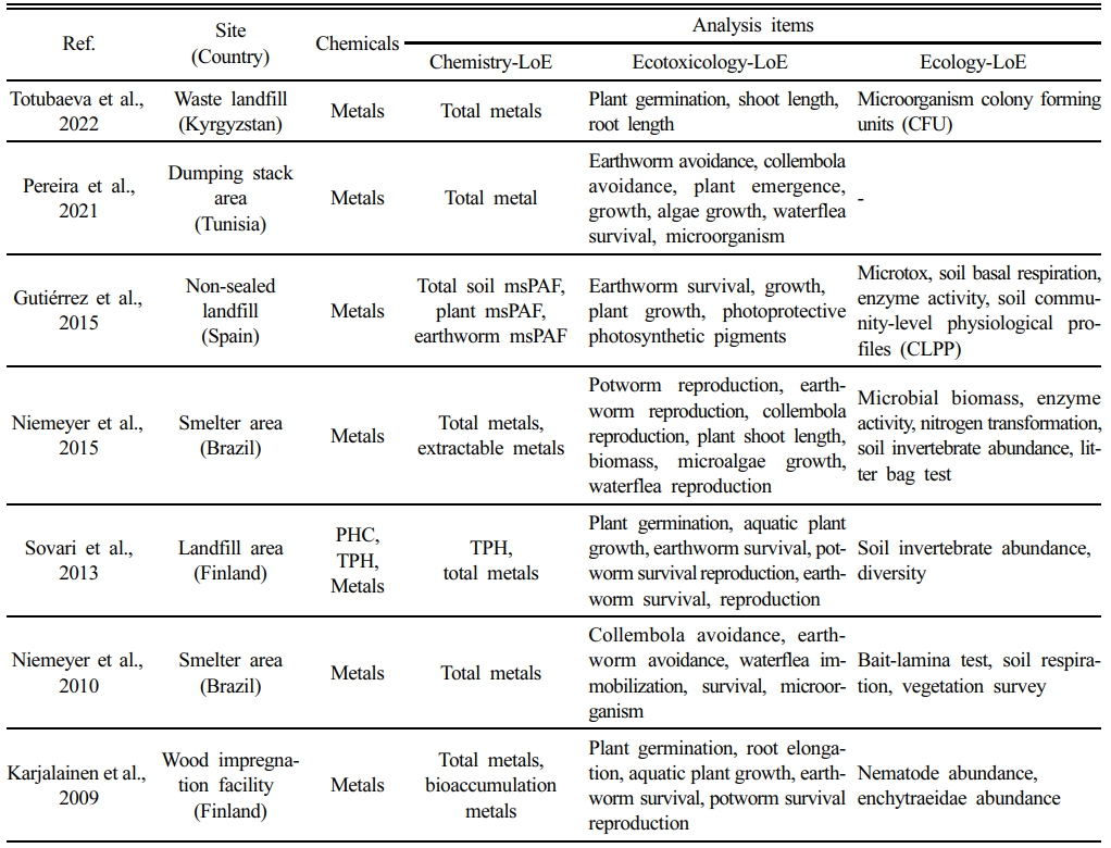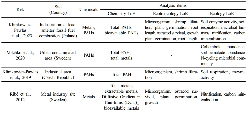 산업부지를 대상으로 한 연구사례는 4건으로 확인되었다(Table 3). Ribé et al.(2012)은 금속산업부지 토양의 총 금속농도와 추출가능 농도를 평가하였다. 토양 추출액 대상으로 미생물(A. fischeri)평가와 토양 대상의 패충류(H. incongruens), 식물(Rhaphanus sativus L., Trifolium repens) 독성평가를 수행하였으며, 질산화 및 탄소광물화를 분석하였다. 평가지점에 따라 LoE 사이의 편차가 서로 다르게 확인되었는데 이는 지점별 오염원에 따른 결과로, 적절한 LoE에 가중치가 부여될 필요성이 있음을 제시하였다. Klimkowicz-Pawlas et al.(2019)은 tier I 수준의 평가를 수행하였는데, PAH 농도 기반의 Chem-LoE와, 새우(T. platyurus)와 미생물(A. fischeri) 평가를 통한 Ecotox-LoE, 토양 호흡과 효소활성 평가 기반으로 산정된 Eco-LoE 값을 통합하여 위해도를 산정하였다. 산정된 위해도는 높은 Chem-LoE에 기인한 것으로 확인되었으며, 이에 따라 더 높은 수준의 평가가 수행되어야 할 필요성을 제시하였다. 또한 부지 및 오염 특성에 따라 동일한 가중치가 아닌 Ecotox-LoE와 Eco-LoE에 더 높은 가중치를 부여할 필요성이 있음을 제시하였다. Klimkowicz-Pawlas et al.(2023)에서는 선행연구에서 확장된 연구로써 tier II 수준의 상세평가를 수행하였다. PAH 총 농도와 생체이용가능 농도를 분석하였고, 토양 대상의 패충류(Heterocypris incongruens), 식물(Sinapis alba L., Lactuca sativa L.), 토양추출액 대상의 미생물(Aliivibrio fischeri), 새우(Thamnocephalus platyurus larvae), 식물(Sinapis alba L., Lepidium sativum L.) 평가를 수행하였다. Eco-LoE는 토양 호흡과 효소활성, 미생물 생체량, 질산화 및 탄소광물화 평가를 기반으로 하였다. IR 산정 시 동일한 가중치를 부여하였으나, PAH 특성을 고려하여 Chem-LoE에 낮은 가중치를 적용하는 경우, 위해도 산정 시 위해도 및 불확실성이 달라질 수 있음을 명시하였다. Volchko et al.(2020)은 tier III 평가 적용에 따른 이점을 제시하는 것을 목적으로 하였다. 해당 연구에서는 더 높은 수준의 평가가 수행되어 많은 비용과 시간이 소요되나, 결과적으로 복원 조치 비용과 온실가스 배출량을 감소시키고 환경영향을 최소화함을 제시하였다.