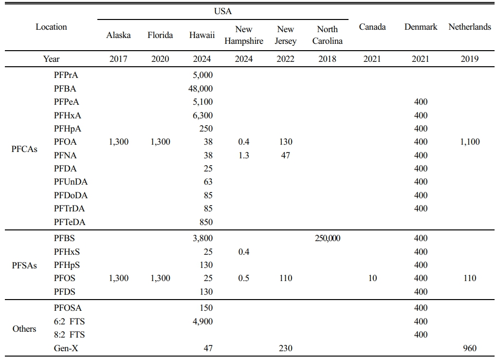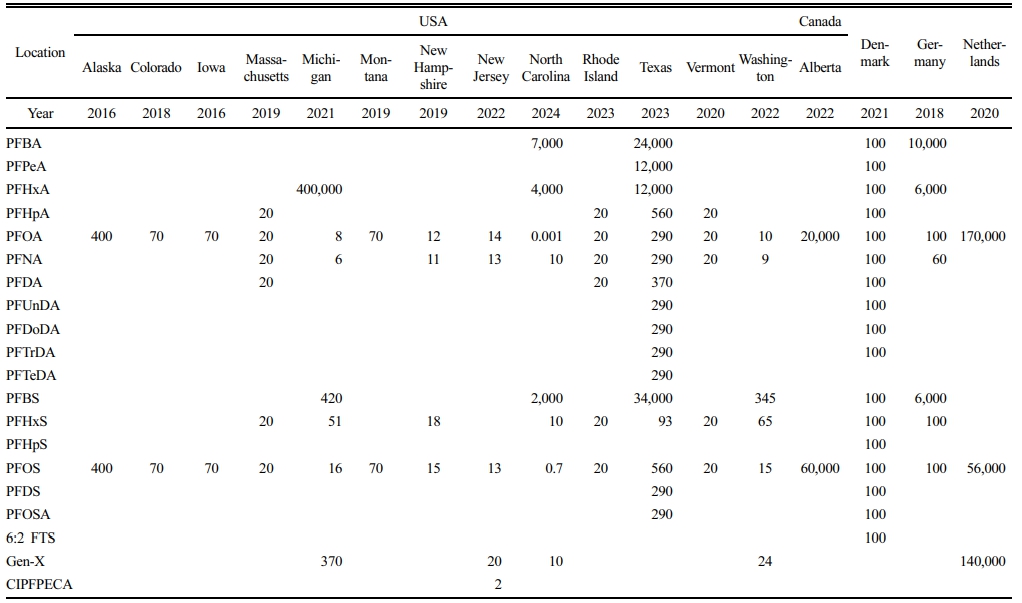 미국 내 13개 주에서 지하수 수질 규제를 시행 중이며, 캐나다(앨버타주) 및 덴마크, 독일, 네덜란드 등에서는 관련 법규를 마련하여 시행 중이다(Table 4). PFAS 물질 중 공통으로 PFOA 및 PFOS를 규제하고 있으며, PFOA 및 PFOS의 농도 범위는 각각 0.001~170,000 ng/L 및 0.7~60,000 ng/L로 넓은 범위에 분포되어 있다. 이 중 최근에 시행된 2024년도 노스캐롤라이나의 임시 최대 허용기준(interim maximum allowable standard)에서는 8종의 PFAS을 규제하고 PFOA 및 PFOS의 농도를 낮게 정하였으며(0.001 ng/L 및 0.7 ng/L), 2023년도 텍사스주에서 시행된 Tier 1 PCL(Protective Concentration Level)에서는 PFAS 16종을 규제 항목에 포함하였다. 덴마크는 2021년도에 지하수 품질기준 항목에 17종의 PFAS가 포함하였다.