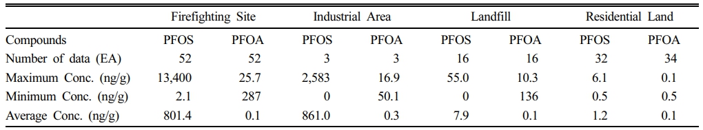 PFOS 및 PFOA를 용도별(화재 현장, 산업 용지, 매립지, 주거지역)로 구분하여 데이터를 분석하였다(Table 5). PFOS는 화재 현장(52개 데이터), 산업 용지(3개 데이터), 매립지(16개 데이터), 주거지역(32개 데이터)에서의 PFOS는 최대 13,400 ng/g, PFOA는 최대 287 ng/g 수준까지 보고되었으며, 특히 화재 현장과 산업 용지에서 고농도로 검출되었다.