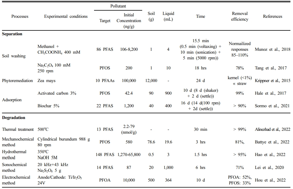 PFAS의 정화기술은 토양으로부터 분리하는 기술과 PFAS를 분해하는 기술로 나누어 볼 수 있으며, 주요 연구 결과는 Table 7과 같다.