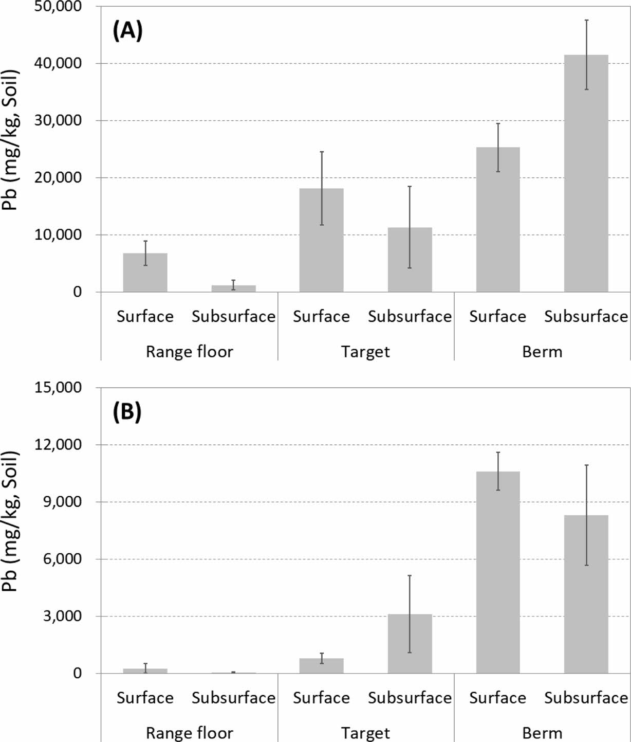 Fig. 5 Pb concentration of soils in the shooting ranges (A: Shooting range in Gangwon province; B: Shooting range in Gyeonggi province). |