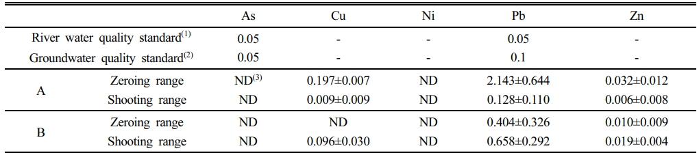 Table 1은 강원도와 경기도에 위치한 연구대상 군부대의 개별 사격장(영점사격장, 실거리 사격장)의 피탄지 표토와 심토를 대상으로 한 인공강우용출시험(USEPA, 1994) 결과를 나타낸 것이다. 표에서 볼 수 있듯이 납의 제련 과정에서 불순물로 존재할 수 있는 비소와 구리 합금 과정에 사용되는 니켈은 검출되지 않았다. 따라서 본 항목으로 인한 환경학적 영향은 낮을 것으로 판단된다.