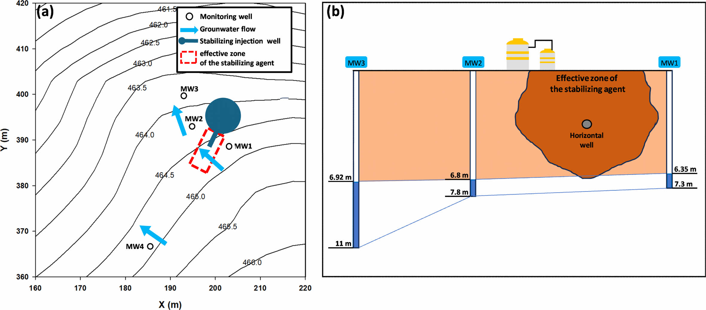 Fig. 1 Schematic of the study site. (a) Plan view with X–Y coordinates and contour lines; blue arrows indicate groundwater-flow direction; the dark-blue filled circle marks the stabilizing-agent injection well; black open circles denote monitoring wells; the red dashed box delineates the expected effective zone of the stabilizing agent. (b) Shows the groundwater levels at monitoring wells MW1–MW3 along the groundwater-flow direction and the effective zone of the stabilizing agent. |