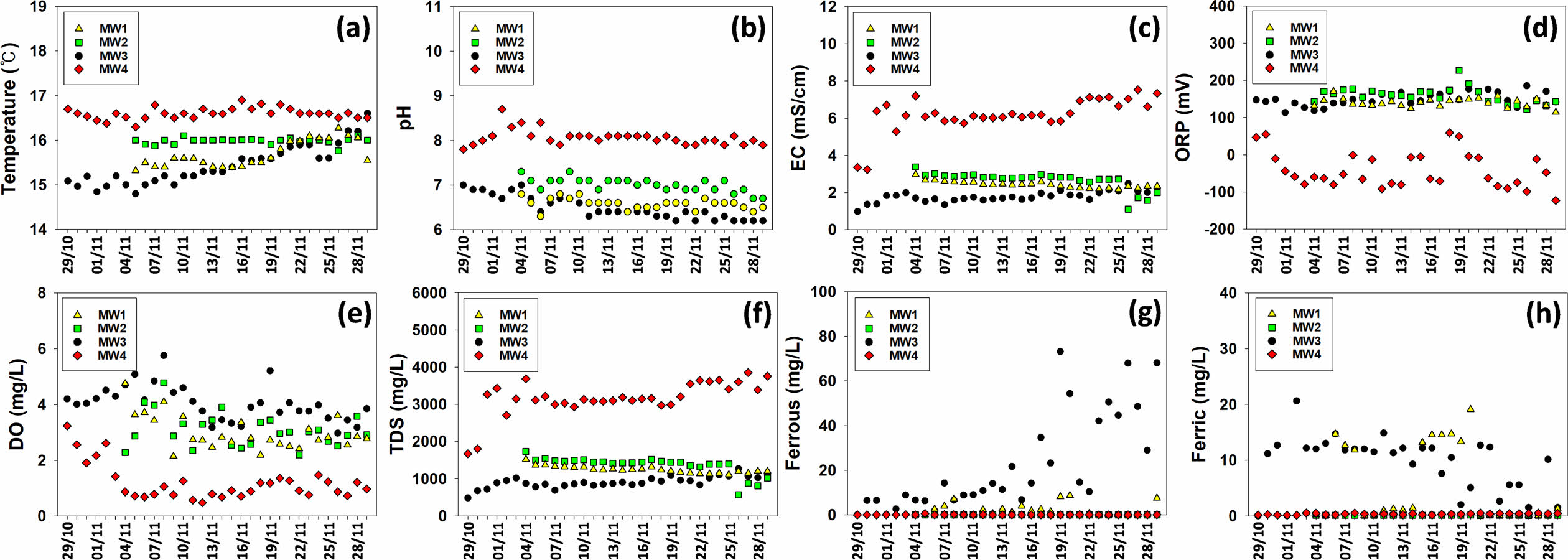 Fig. 2 Time-series variations of groundwater quality parameters: (a) temperature, (b) pH, (c) EC, (d) ORP, (e) DO, (f) TDS, (g) ferrous, and (h) ferric. Symbols denote monitoring wells. (MW1: yellow triangle, MW2: green square, MW3: black circle, and MW4: red rhombus). |
