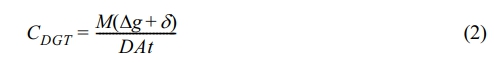 여기서 CDGT는 시간가중평균농도 (mg/L), Δg는 확산 겔과 멤브레인 필터 두께의 합(cm), D는 중금속의 확산계수(cm2/s), A는 멤브래인 필터의 면적(cm2)을 나타내며, 일반적으로 3.14 cm2을 사용하지만, DBL의 두께를 고려한 TWAC를 산정하기 위해 3.8 cm2을 사용했다(Warnken et al., 2006; Davison and Zhang, 2012).