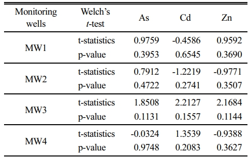 Fig. 3은 안정화제 주입 전후 시간에 따른 지하수 내 As, Cd, Zn 농도의 변화를 관정별로 나타냈다. 불포화대 내 안정화제 주입이 지하수 중금속 농도에 미치는 영향을 평가하기 위해, 안정화제 주입 전후 중금속의 평균 농도를 Welch’s t-test로 비교했다(Table 1). 분석 결과, MW1에서 As, Cd, Zn 각각 p = 0.3953, p = 0.6545, p = 0.3690으로, 유의수준 0.05를 초과했으며, MW2에서도 Welch’s t-test 결과, As, Cd, Zn에서 유의수준 0.05를 초과해 안정화제 주입 전후 중금속 농도의 유의한 차이는 없었다. MW3에서는 11월 4일에 As 농도가 0.03 mg/L로 상승하는 모습을 보였지만, 이후 11월 6일부터 0.003 mg/L로 감소한 후 일정한 농도를 유지하는 모습을 보이고 있으며, Cd와 Zn 또한 시간에 따라 작은 범위 내에서 변화하는 모습을 보였다. MW4는 주입의 영향을 받지 않기 때문에 시간 경과에 따른 농도 변화가 적을 것으로 예상되었으며, Welch’s t-test 결과, 안정화제 주입 전후 농도 차이는 유의수준 0.05를 초과해 안정화제 주입 전후 중금속 농도의 유의한 차이가 관찰되지 않았다.