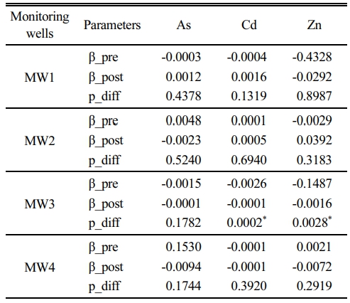 시간적 지연과 점진적인 농도 변화를 고려하기 위해 시계열 자료에 기반한 접근이 필요하며, segmented regression은 이에 적합한 기법이다. Fig. 4는 DGT를 이용해 측정된 As, Cd, Zn의 시간별 농도 변화를 대상으로 segmented regression을 적용한 결과를 나타낸 것이다. 각 그래프의 적색 실선은 변화점을 기준으로 분절된 회귀선을 나타내며, 청색 점선은 통계적으로 추정된 변화점의 시점을 나타낸다. Table 2는 관정에 따른 변화점 전후의 기울기(β_pre, β_post)와 기울기 변화량 차이에 대한 유의확률(p_diff)을 나타냈다. MW3에서는 Cd 및 Zn에서 각각 p = 0.0002, p = 0.0028로, 유의한 기울기 변화가 관찰됐으나, 해당 변화점은 안정화제 주입 이전에 발생했다. 이는 안정화제 주입에 의한 영향으로 판단하기 어려우며, 주입 전 자연적인 요인에 의한 농도 변화로 해석된다. As의 경우, 변화점은 안정화제 주입 이후로 식별됐으나, 기울기 변화는 통계적으로 유의하지 않았다. MW1, MW2 및 MW4에서는 최대 0.462로 안정화제 주입 전후 기울기 변화는 존재했지만, 통계적으로 유의하지 않은 수준을 보였다.