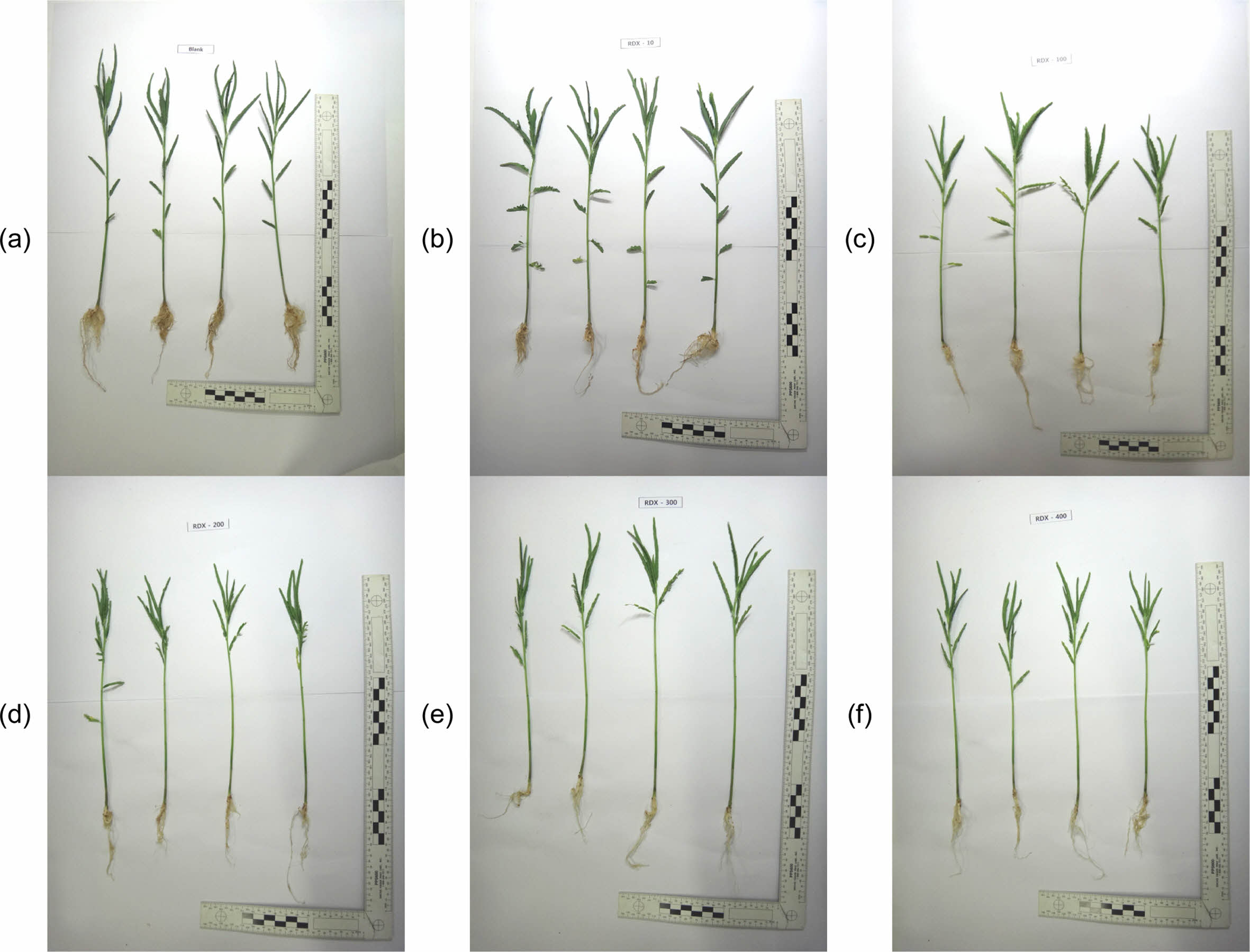 Fig. 1 Comparison of Aeschynomene indica seedling growth reveals decreased root development and increased branch abscission with higher RDX concentration (mg/kg) in the pot soil. (a) blank, (b) 10, (c) 100, (d) 200, (e) 300, (f) 400. |