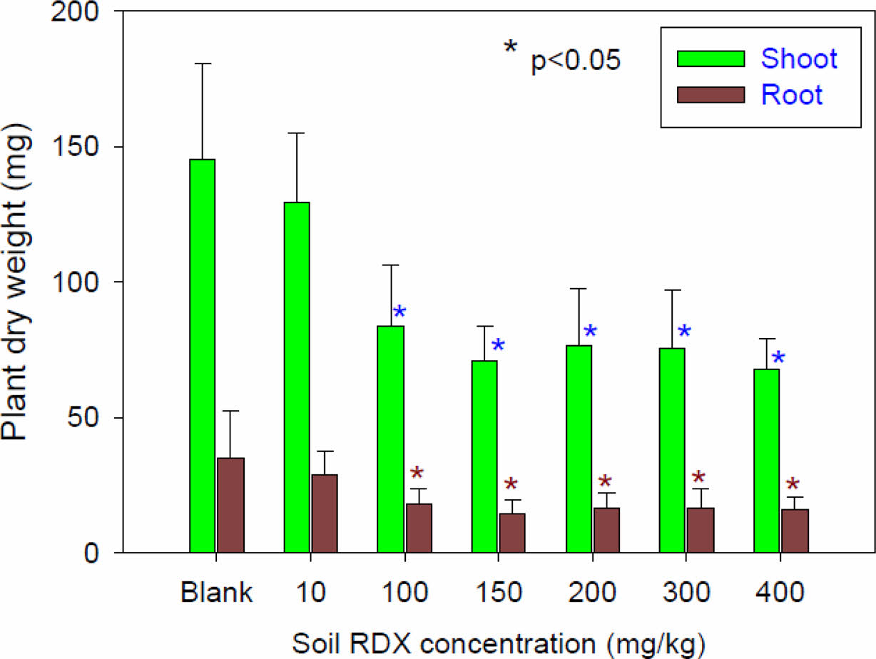 또한 Fig. 1에서와 같이 RDX 100 mg/kg부터 농도 증가에 따라 식물뿌리의 밀도 및 길이생장 감소가 확연하다. 토양 RDX 농도 100 mg/kg은 RDX의 잠재적 위해 판단 및 정화목표 설정을 위한 기준으로 제시된 바 있다(Talmage et al., 1999). 식물체량의 변화를 건조중량(n = 10)으로 비교하면 Fig. 2와 같다. Blank 처리군에서 지상부 및 뿌리 건량은 각각 145.3 ± 35.5 및 35.1 ± 17.1 mg-DW이었으나, RDX 100 mg/kg에서는 지상부 및 뿌리 건량은 각각 83.7 ± 22.7 및 17.8 ± 5.8 mg-DW로 감소하였는데, 통계적으로 유의(p < 0.05)하였다. 반면 RDX 400 mg/kg에서는 각각 67.6 ± 11.3 및 16.0 ± 4.6 mg-DW로, RDX 100 mg/kg 이상 농도에서는 감소세가 둔화되어 일정값에 점근하는 형태를 보이고 있다. RDX 농도 증가에 의한 길이생장 저해, 가지 탈락 및 생체량 감소와 같은 명확한 독성 효과에도 불구하고, 21일간의 실험에서 각 농도별로 식재한 자귀풀 유식물 10개체는 모두 생장하였다. 이 결과는 Winfield et al.(2004)가 15종의 식물체에서 관측한 것과 같이, 생장 단계에서 다양한 독성이 발현되어 생장이 둔화되었지만, 식물을 사멸시키는 영향은 없었다는 결과와 동일하다.