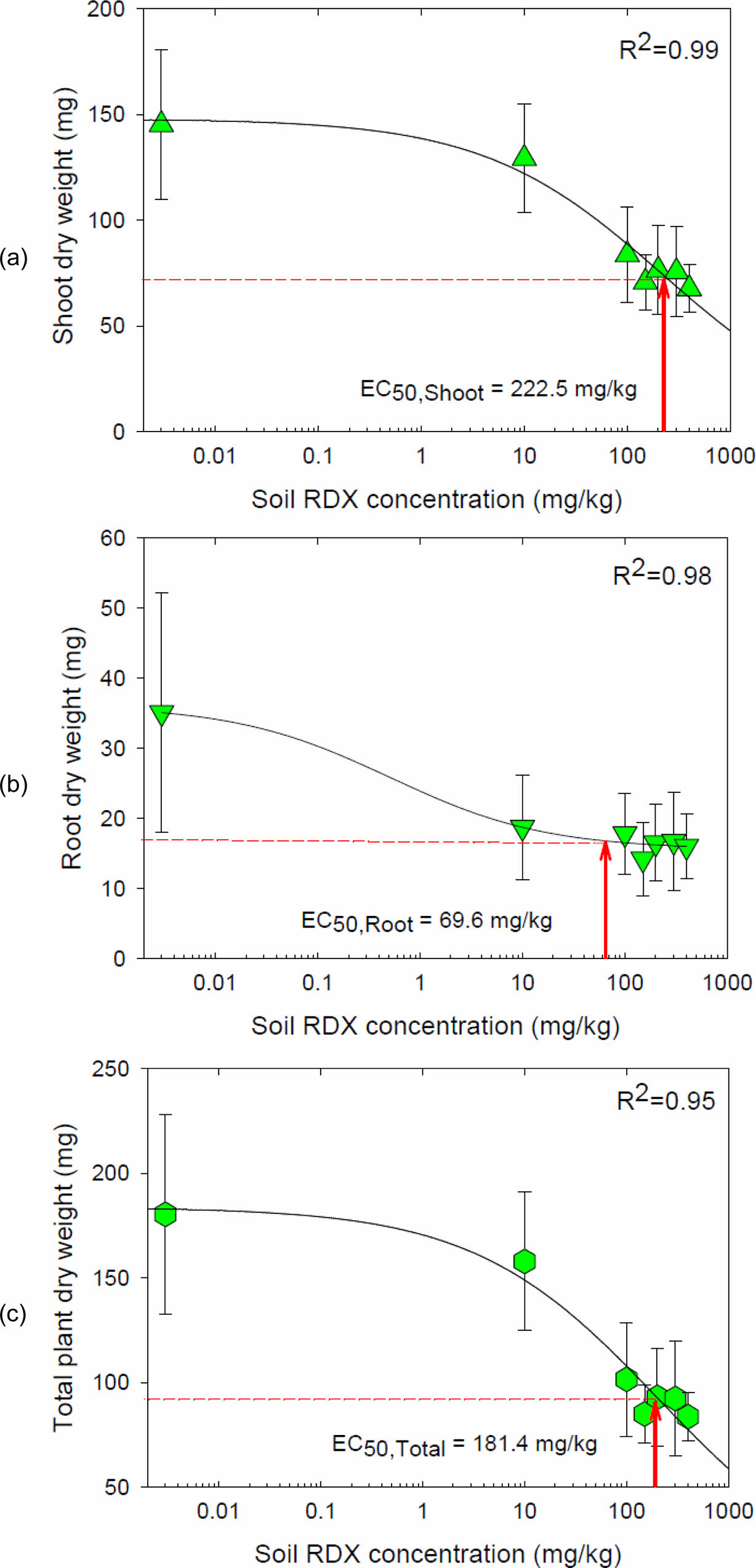 Fig. 3 Estimated 50% effective concentration (EC50) of Aeschynomene indica on soil RDX by 4 parameter logistic model using plant dry mass (a) above-ground, (b) root, (c) total. Error bar represents standard deviation. |