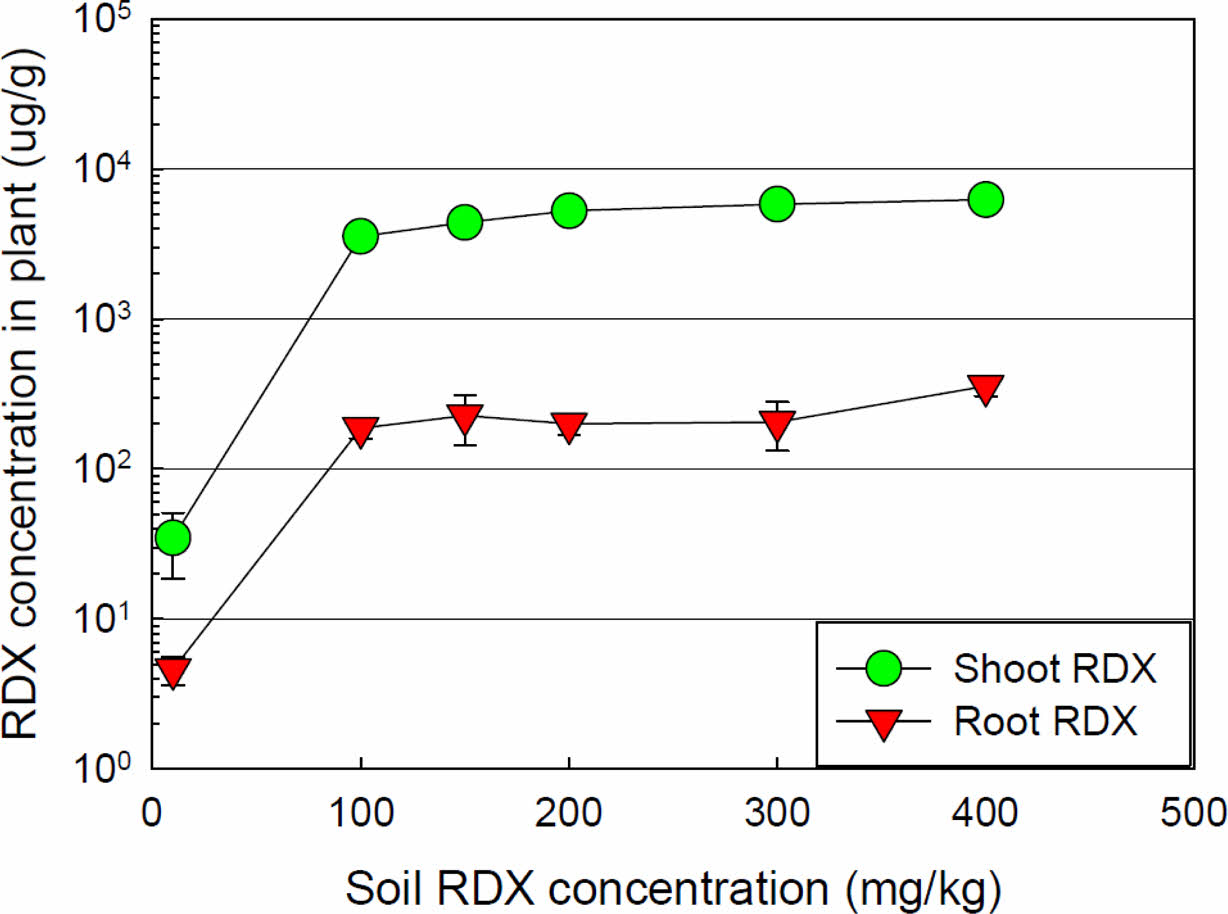 군사격장은 대부분 오지에 위치하여 동력원을 설치하기 어려운 반면, 부지가 넓어 식물상 정화공법와 같은 친환경적 정화법을 적용하기에 적합하다. 다수의 연구에 의하면 갈풀을 포함한 9종의 정수 및 수생식물(Best et al., 1997), 옥수수, 콩, 빨간 무, 상추, 토마토 등의 작물(Cataldo et al., 1990; Larson, 1997), 밀과 벼(Vila et al., 2007a)와 같은 곡물, 호밀풀 및 토끼풀을 포함하는 많은 수의 초본식물(Rocheleau et al., 2008; Winfield et al., 2004)과 목본인 포플라(Thompson et al., 1999)도 토양에서 RDX를 흡수/분해하였다. 식물이 흡수한 RDX는 곧바로 잎과 줄기를 포함하는 지상부로 이송되는데, 식물종에 따라 60% (Thompson et al., 1999) 혹은 80% 이상(Vila et al., 2007b)이 지상부에서 검출되었다. 지상부에서는 식물 효소에 의한 분해와 광분해가 동시에 발생하여 RDX보다 극성이며, 분자량이 300배 이상이 되는 전환산물이 생성되었다(Larson et al., 1999; Just and Schnoor, 2004). Hagan et al.(2016)은 16종의 속씨식물을 RDX 오염토양(농도 100, 500 및 1000 mg/kg)에 파종하여 75일간 재배하였다. 그 결과 16종의 식물에서 생장 저해가 관측되었고, 2종의 식물에서는 오히려 생장이 증진되었다. 특히 콩과식물인 왕관칼퀴나물(Coronilla varia)은 잎에 최대 36 mg/plant의 RDX를 축적하였다.