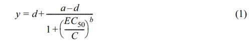 실험에서 측정된 각 처리구에서의 자귀풀 건조중량값은 4변수 로지스틱 회귀모형(식 (1))에 의해 AAT Bioquest 웹페이지에서 EC50을 산정하였다. 이때 비교를 위해, 지상부, 뿌리 및 전체 건량에 대해 각각 계산하였다(Fig. 3). 회귀모형에 의해 산정된 EC50값은 지상부 222.5 mg-RDX/kg-soil이고, 뿌리는 69.6 mg-RDX/kg-soil로 지상부에 비해 뿌리에 대한 RDX의 독성이 3.2배 높았다. 그에 따라 자귀풀 전체건량으로 산정된 EC50값도 감소하여 181.4 mg-RDX/kg-soil으로 산정되었다.
