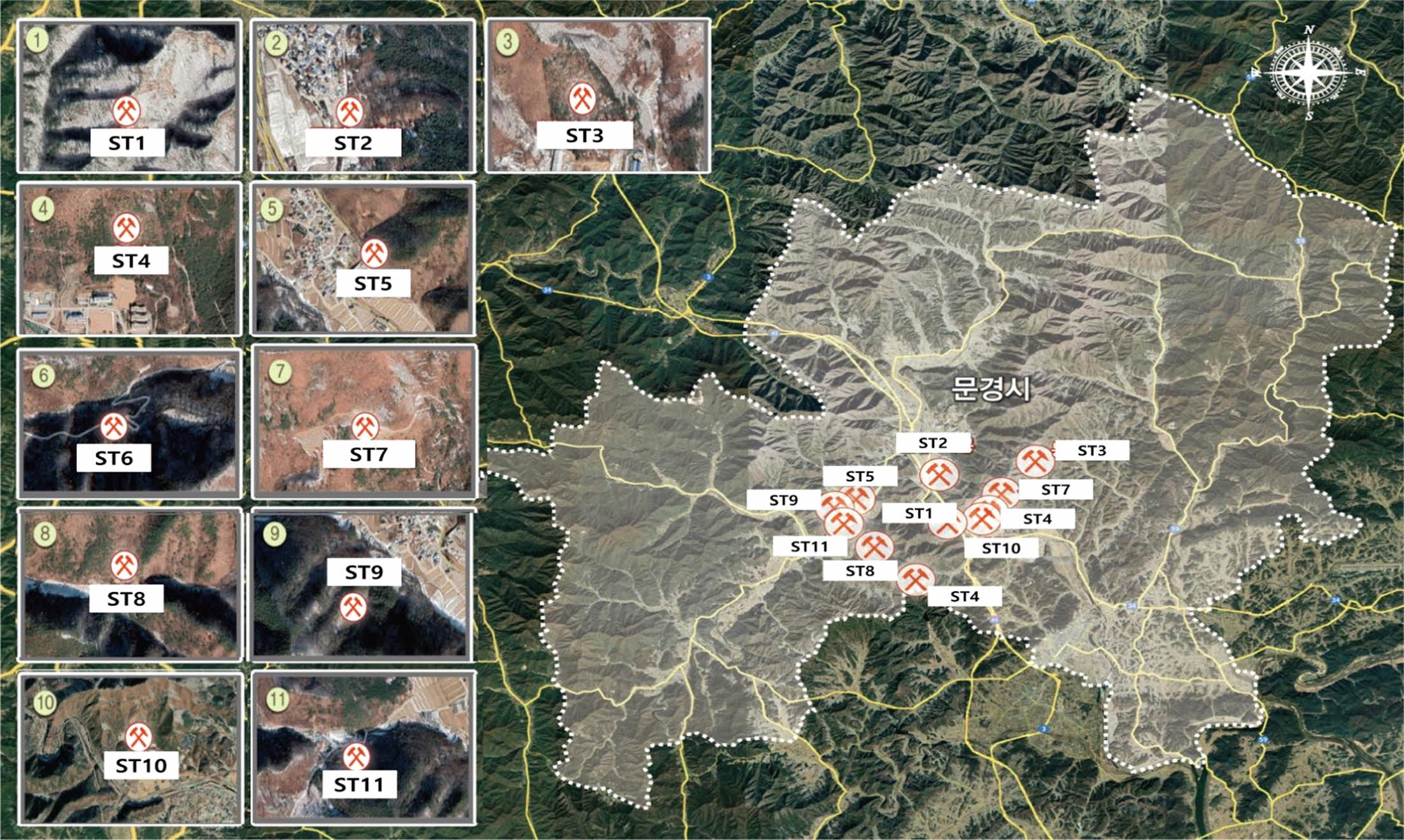 조사 대상 지역은 11개 폐석탄광산이 위치해 있으며, 현재에도 잠재적 오염원으로 작용하고 있는데, 산성광산배수가 지속적으로 발생하고 하천과 농경지로 유입되고 있는 실정이다(Kwon et al., 2017). 선행 연구에서도 해당 지역에서의 As, Cd, Pb 등 중금속의 용출과 축적이 보고된 바 있다(Kwon et al., 2017; Ji et al., 2013). 본 연구의 조사 지점은 광산별 오염원 분포와 지형과 수리학적 조건, 인근 농경지 이용 현황을 종합적으로 고려하여 선정하였다(Fig. 1). 본 연구에서는 평가 대상인 논(답) 경작지를 중심으로 지점을 선정하였으며, 토양 시료는 표토(0 – 15 cm), 중도(15 – 30 cm), 심토(>30 cm)로 구분하여 채취하였다. 토양 조사는「토양오염공정시험기준」에 준하여 수행되었다(NIER, 2022).