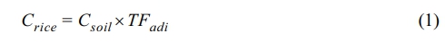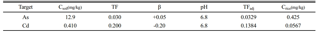 쌀 내 중금속 농도(Crice)는 토양농도(Csoil)와 보정된 전이계수(TFadj,Transfer Factor)를 통해 산출하였으며, 쌀 내 중금속 농도 산정 수식은 (1)과 같다.