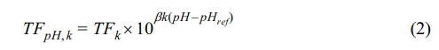 pH 보정 함수는 TF의 금속에 대한 전이계수로 β는 회귀계수, pHref는 기준 pH를 의미한다. 여러 선행 연구에서 log10(TF)와 토양 pH 사이에 선형관계가 제시되어 왔으며(Kwon et al., 2017, Ji et al., 2013) 이를 반영하여 본 연구에서는 금속 k에 대해 log10(TF)와 토양 pH 사이의 선형관계를 가정하여, pH에 따른 전이계수 변화를 보정하였다. pH 보정 함수 수식은 (2)와 같다.