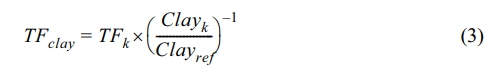 점토율(clay, %) 차이에 따른 식물 이용 가능성 변화를 선형 가정으로 보정하였다. 기준 점토율(Clayref) 대비 현장 점토율(Clayk)이 클수록 상호작용 증가에 따라 TF가 감소하는 현상을 반영하였다. 점토율의 산정 수식은 (3)과 같다.