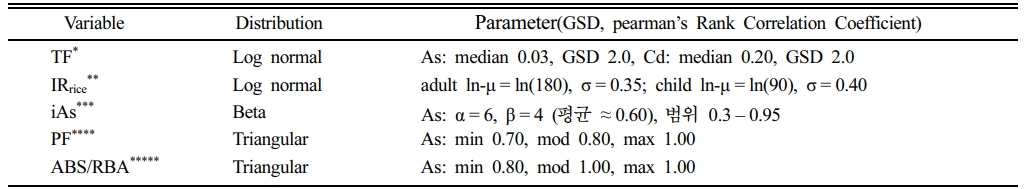 여기서 전이계수(TF)는 기존 문헌(Kwon et al., 2017; Jung et al., 1997; Mao et al., 2019)을 기반으로 하였으며, 토양 pH, 점토율, 무기형태, 도정 및 취사 과정에서의 농도 저감효과를 반영하여 보정 하였다.