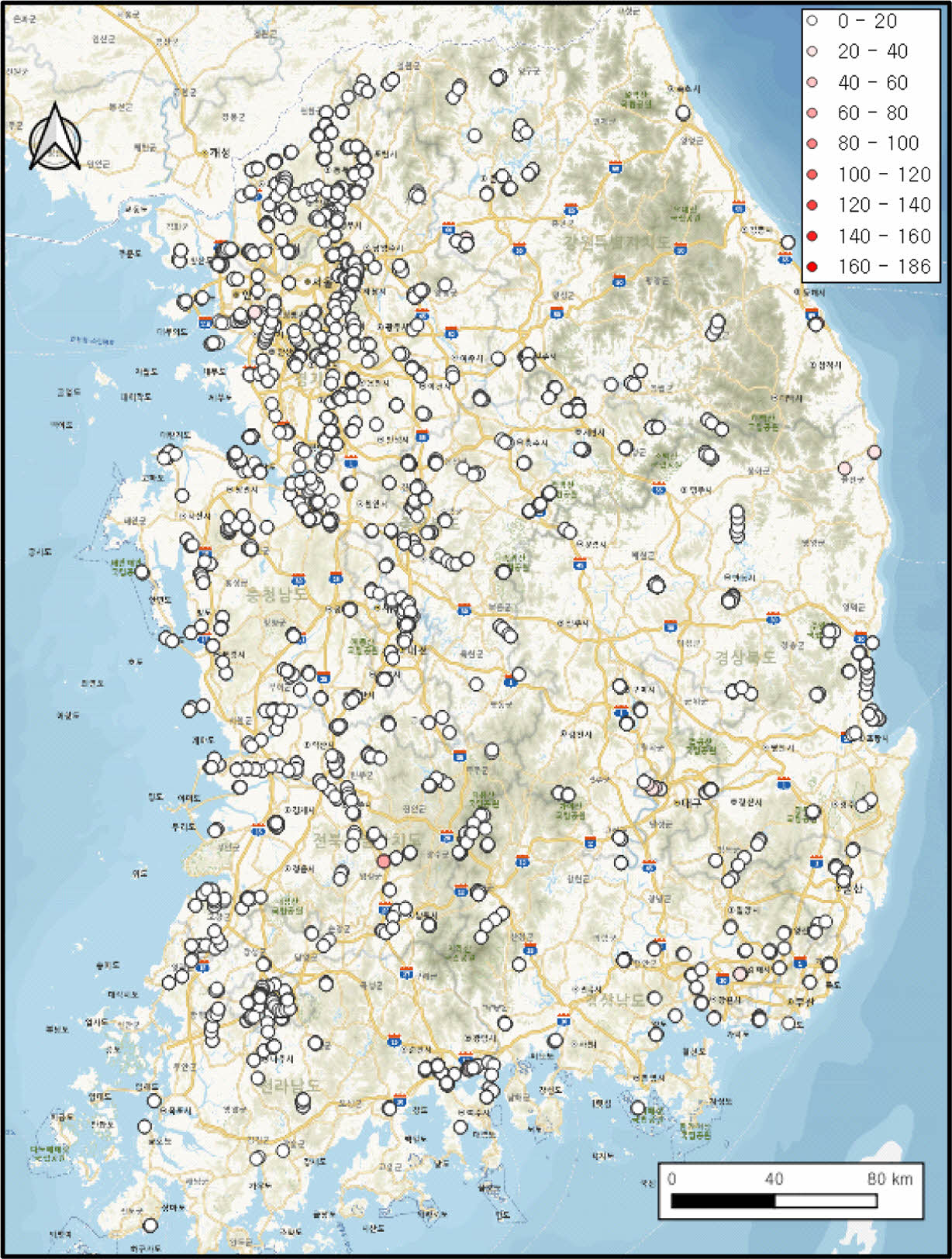 토양조사지점은 환경영향평가정보시스템에 등록된 4,646개의 환경영향평가서 중 토양조사 지점 4,152지점의 오염농도를 추출하여 모델링을 수행하였으며, 각 오염물질별 조사지점은 TM 좌표가 기록되어 있는 자료만 이용하였다. 환경영향평가정보시스템의 지리정보서비스내 환경영향평가 사업을 검색하여 제공된 모든 환경영향평가 내용의 상세정보를 찾을 수 있으며, 평가서 정보내에 기초 데이터를 추출할 수 있다. 이중 토양 항목내의 조사자료를 추출하여 기초 자료로 활용하였으며, 결과는 부록에 수록하였다.