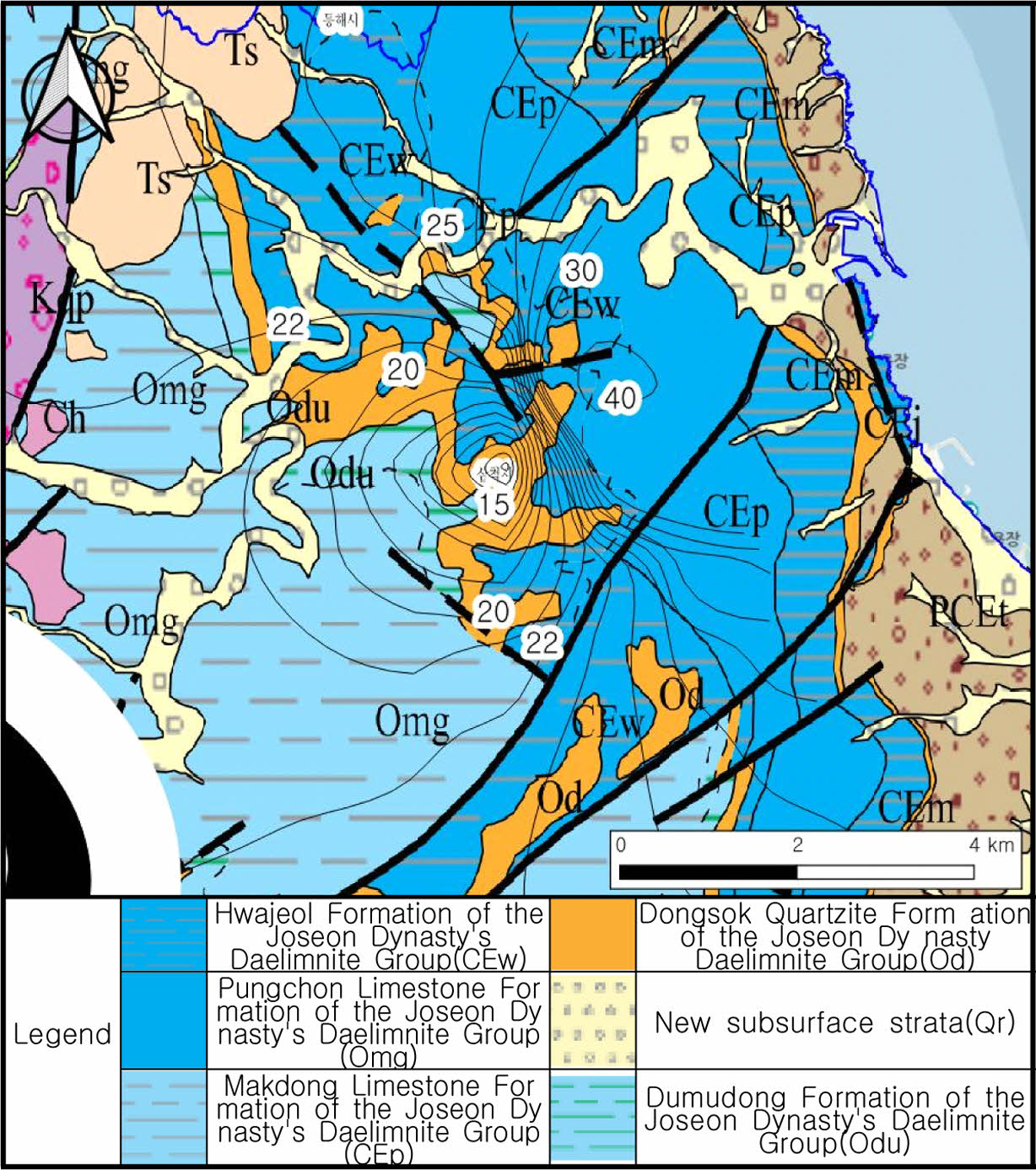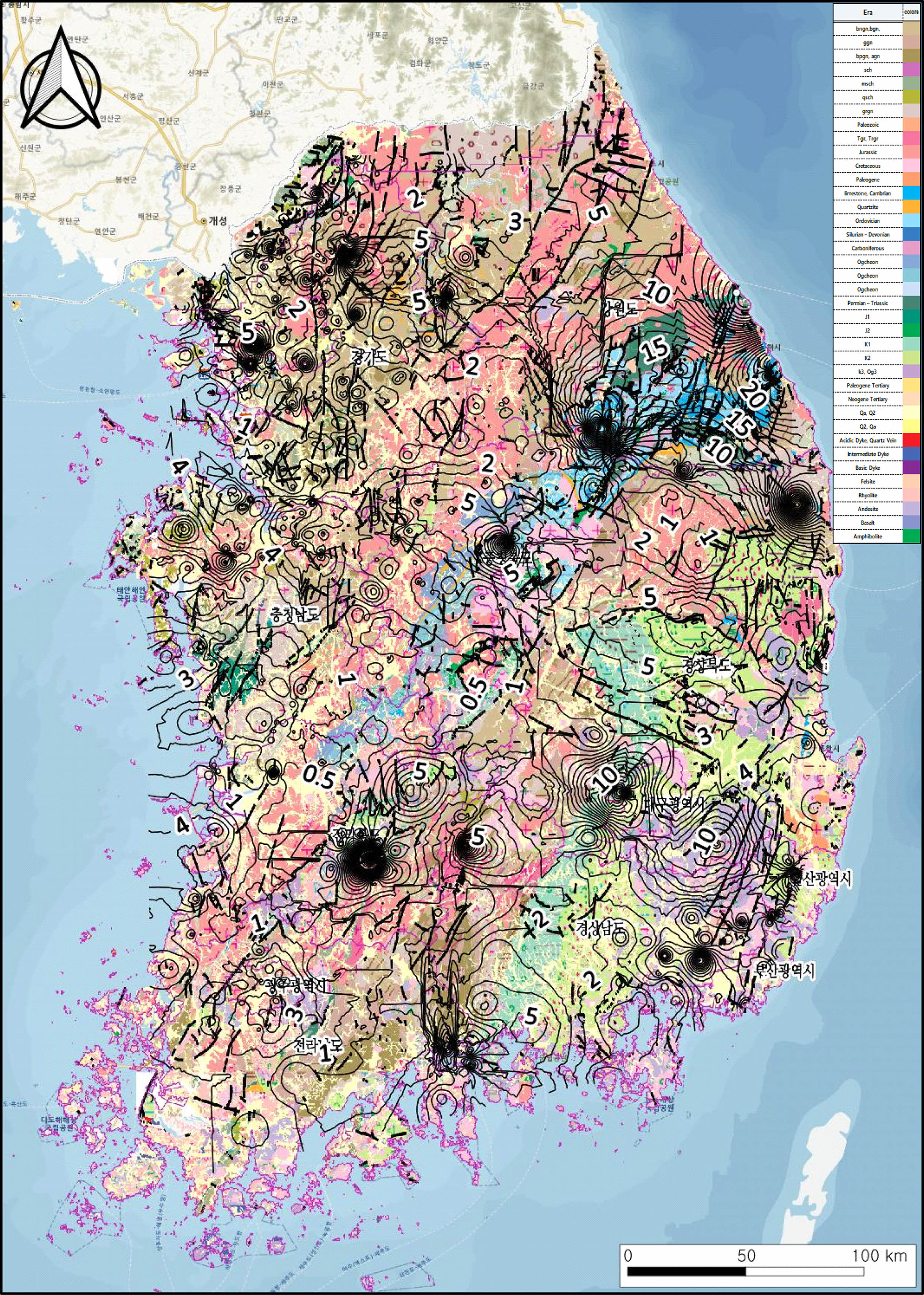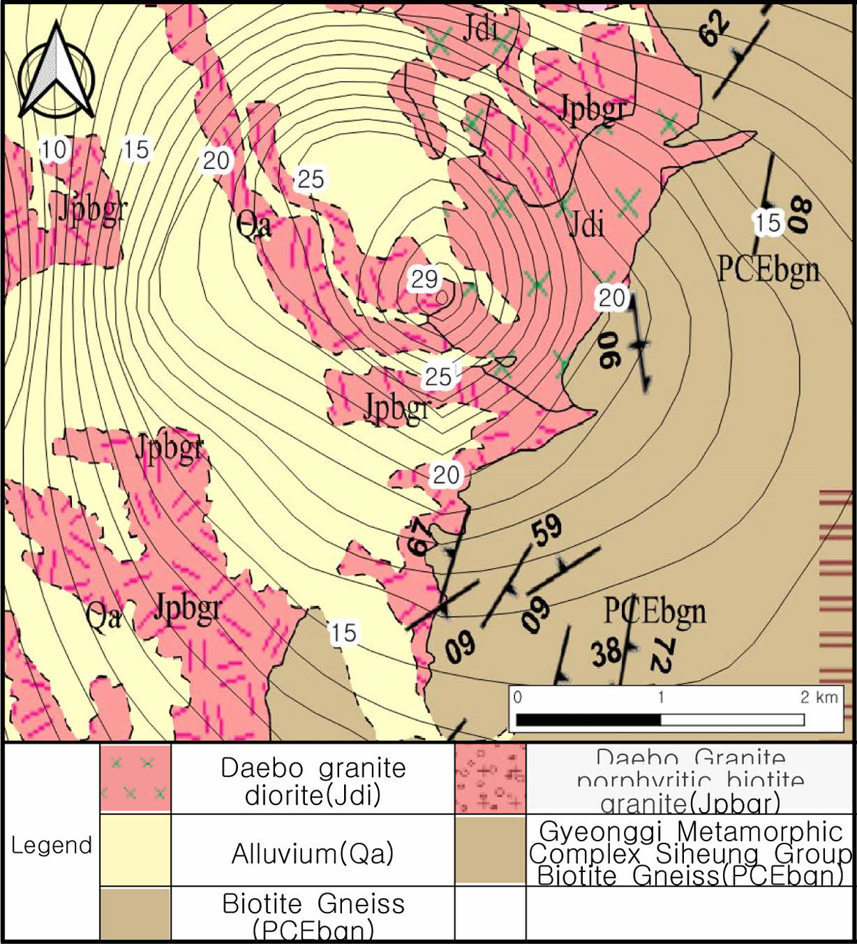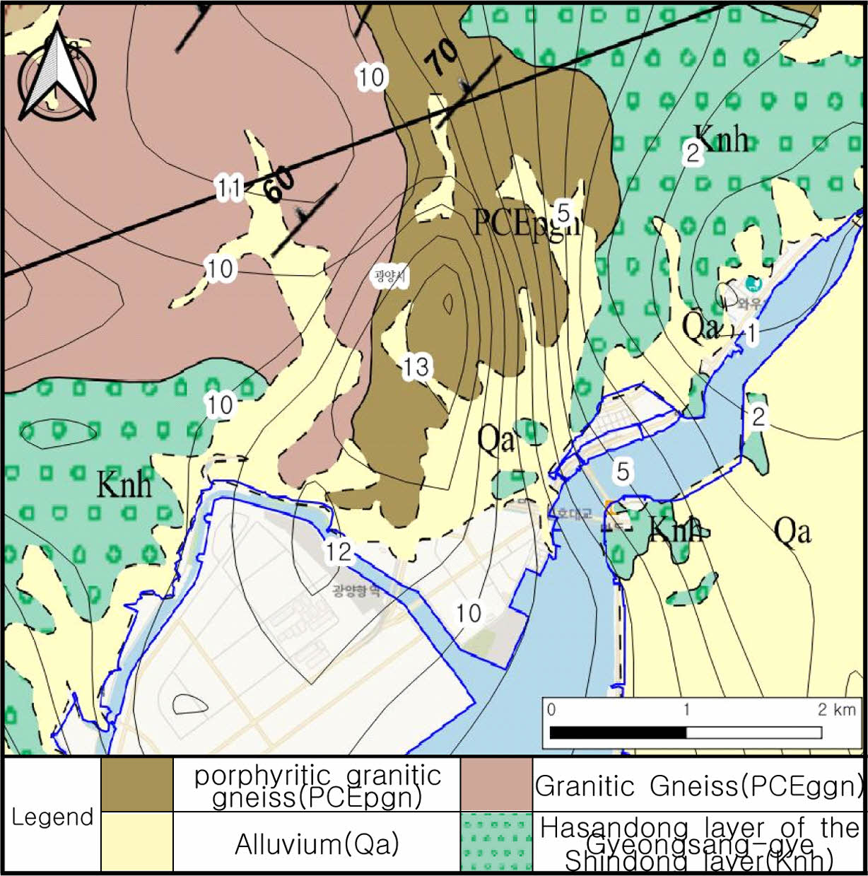비소농도별 지질 및 지층분석은 지질정보시스템(https://data.kigam.re.kr/)에 제시된 전국 5만 수치 지질도를 이용하여 비소 등농도곡선과 중첩하였다(Fig. 3). 중첩된 지질도를 이용하여 해당지역의 지층을 추출하였으며, 지질정보는 비소농도가 높은 상위 20개 지역에 대하여 지층 및 대표 암질을 Table 2에 나타내었다.