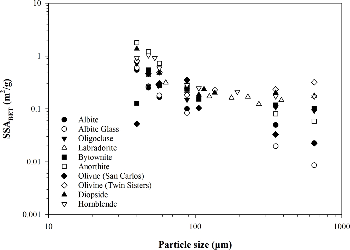 Fig. 2 Specific surface area as function of particle size in silicate minerals. |
