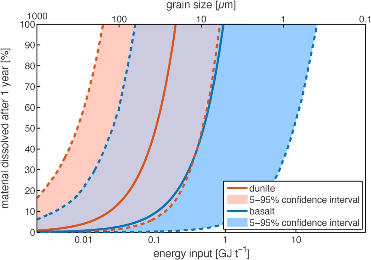 Fig. 3 Relationship between the mineral dissolution rate and grain size or the required energy for grinding (Stefler et al., 2018). Used under Creative Commons Attribution License (CC-BY). |