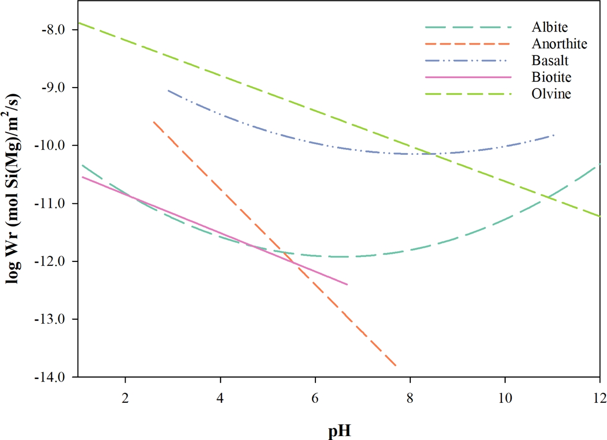 pH는 규산염 광물 등 원료의 풍화속도에 직접적인 영향을 미치며, 이는 풍화촉진의 탄소격리 효율성을 결정하는 핵심 요인이라 할 수 있다. 원료의 pH에 풍화속도 차이는 각 광물의 구조적, 화학적 특성에 따라 서로 다른 반응 메커니즘을 따르는데 주로 산성 조건(pH < 6)에서는 양성자 (H+)가 광물 표면의 금속-산소 결합을 공격하여 풍화를 촉진시키는 반면, 염기성 조건(pH > 8)에서는 수산화이온 (OH-)이 규소-산소 결합을 약화시켜 풍화를 가속화시킨다(Brantley, 2008). Fig. 4는 pH에 따른 광물별 풍화속도를 나타낸 것으로 산성 토양에서는 감람석(olvine)이, 중성-약알칼리성 토양에서는 감람석 또는 현무암(basalt)이 효과적인 풍화속도를 나타낼 것으로 예상하는 등 광물 선택의 중요한 정보를 제공한다(Brantley, 2008).