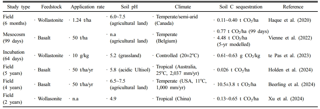 2010년대 초반부터 현재까지 EW를 통한 토양탄소격리에 관한 연구가 확대되었다. 초기 모델링 연구들은 높은 기온과 강수량, 낮은 토양 pH를 특징으로 하는 열대 지역이 EW를 적용하기에 최적일 것으로 예측하였다(Köhler et al., 2010; Taylor et al., 2016). Taylor et al.(2016)은 전지구 기후 모델을 이용하여 원료의 처리량에 따라 2100년까지 대기 중 CO2를 30~300 ppm 감소시킬 수 있을 것으로 전망하였다. 이후 다양한 실험규모와 현장 조건에서 실증 연구가 수행되었으며, 그 결과는 초기 모델링의 가정과는 다르게 나타났다(Table 2).