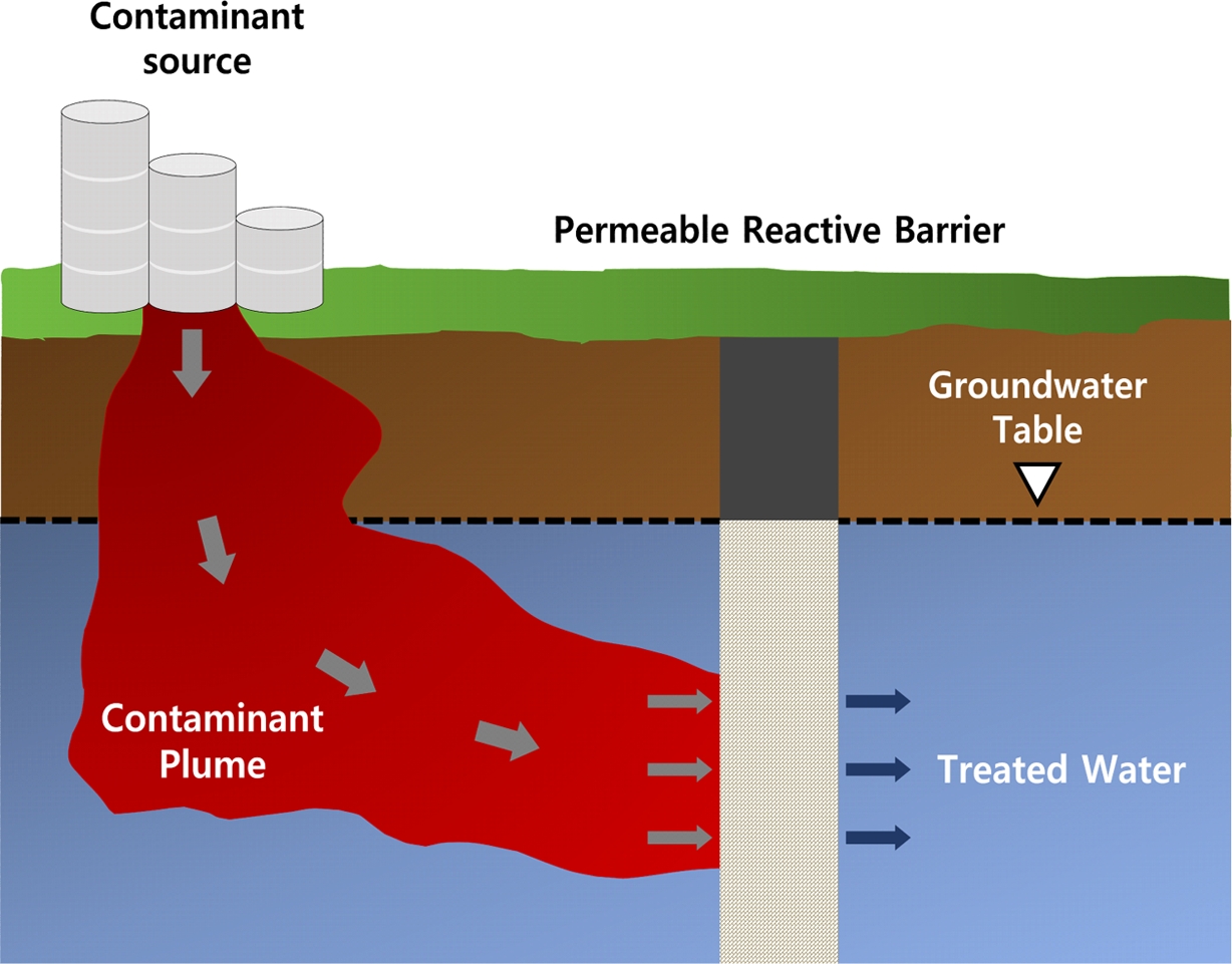 지하수 내 질산염을 처리하기 위한 방법 중 하나로서 투과성 반응벽(permeable reactive barrier; PRB) 기법이 이용되고 있다. 투과성 반응벽이란 반응성 물질을 지하에 배치하여 오염운(plume)을 차단하고, 지하수 흐름에 따라 반응성 물질을 통과하면서 오염물질을 정화하는 기술을 말한다. 투과성 반응벽은 지상에서 장비를 이용해 정화하는 적극적인 정화법과는 다르게, 자연적인 지하수 흐름 하에서 정화가 이루어지므로 지하 환경의 변화를 최소화할 수 있다는 장점을 지닌다. 또한 초기 비용 외에 드는 운영 비용이 낮으며, 오염된 부지의 지표면을 다른 용도로 활용이 가능하다는 경제적 이점도 제공한다(Li and Liu, 2022; Obiri-Nyarko et al., 2014).