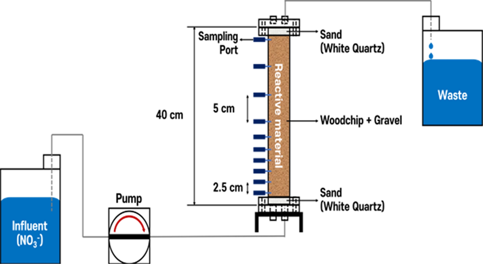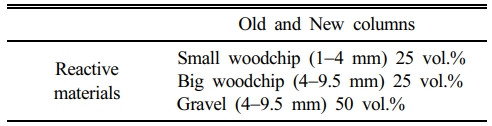 두 칼럼은 모두 유기 탄소원으로서 우드칩을 사용하였다. Old 칼럼은 참나무 재원의 우드칩(Farmsco, Korea)을, New 칼럼은 소나무 재원의 우드칩(바우농자재, Korea)을 사용하였다. 재료 크기에 따른 칼럼 내 불균질성 흐름을 방지하기 위해 우드칩을 크기별(소형 우드칩: 1-4 mm, 대형 우드칩: 4-9.5 mm)로 절단 및 채질하였으며, 소형 우드칩과 대형 우드칩을 부피 비율 1:1로 혼합하여 사용하였다. 우드칩의 크기가 작을수록 유입수와의 접촉 면적이 증가하여 탈질 박테리아를 위한 유기탄소의 공급을 촉진시킨다(Peterson et al., 2015). 따라서 소형 우드칩은 빠른 유기탄소 분해와 박테리아 성장 촉진을, 대형 우드칩은 칼럼의 장기 안정성 유지를 목적으로 사용하였다. 자갈은 유입수가 칼럼 내부를 원활하게 통과할 수 있도록 만들어 주며, 4-9.5 mm로 채질한 뒤 증류수(deionized water; DI)로 세척하여 상온 건조 후 사용하였다. 추가로 칼럼 내부에서의 탈질 박테리아 활성화를 위해 소량의 자연토양을 넣어주었다. 자연토양은 전라북도 전주시 덕진연못에서 채취하였으며, 칼럼 패킹 과정에서 5 cm 간격으로 약 5-10 g 넣어주었다. 칼럼 반응물질 및 혼합 비율은 Table 1에 제시하였다.