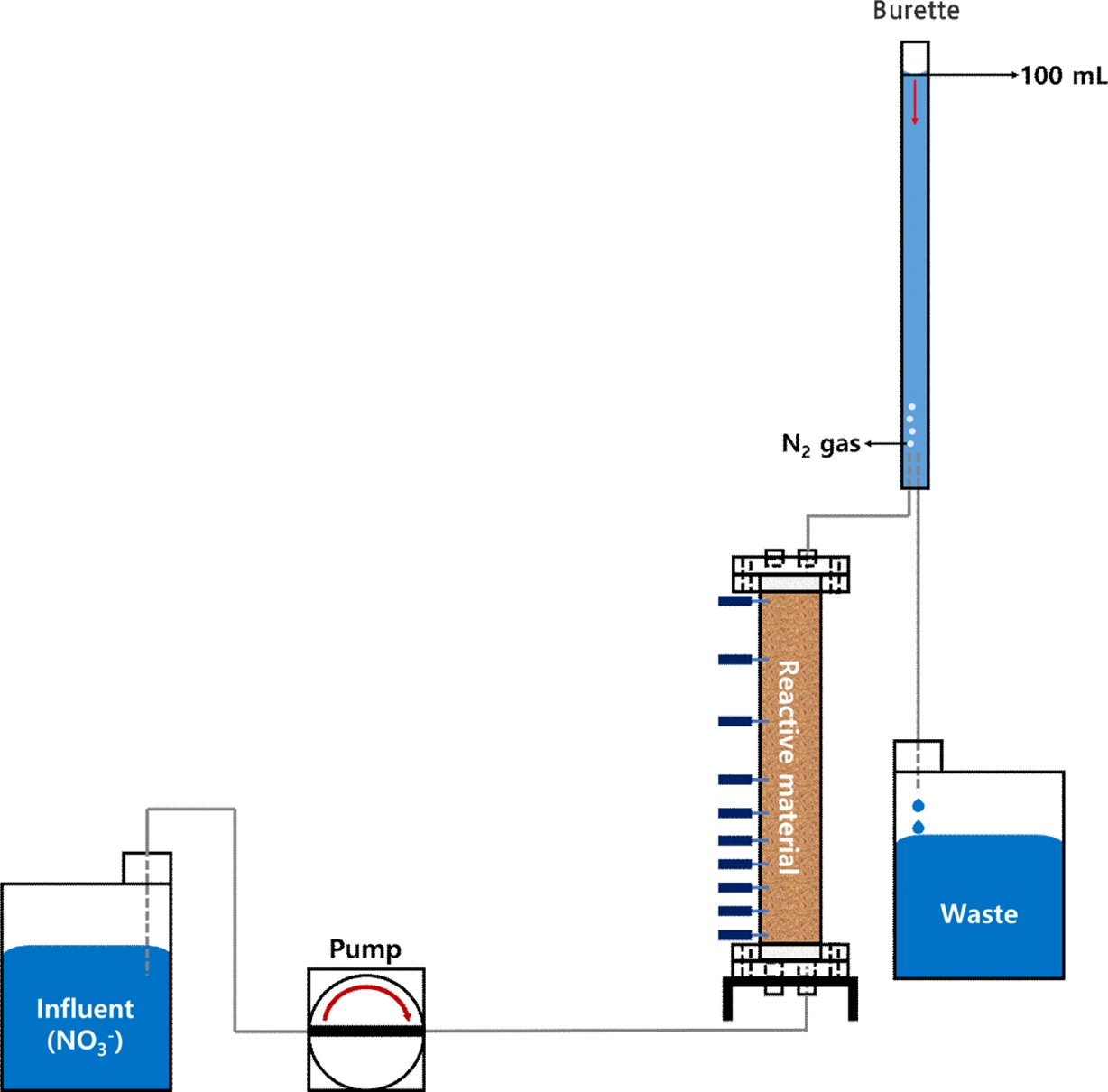 반응물질로서 사용되는 유기 탄소원은 생물학적 탈질화의 주요 결정 요인으로 작용하기 때문에 적절한 유기 탄소원을 선정하는 연구가 다수 수행되고 있다. 예로서, Liu et al.(2020)은 옥수숫대(corncob)를 반응물질로 사용하여 처리된 물이 중국의 질산성 질소 음용수 기준을 충족할 수 있음을 확인하였으며, Mollamohammada et al.(2020)은 미세조류를 활용하여 지하수 내 질산염에 대해 약 90% 수준의 제거 효율을 보여주었다. 최근의 투과성 반응벽 연구는 영가철과 같은 재료의 반응 원리에 집중하던 과거와 달리, 친환경 및 저비용 재료를 사용하여 지속 가능성과 비용 효율성에 초점을 두는 방향으로 변화하고 있다(Sánchez Hidalgo et al., 2025). 하지만 이러한 재료를 활용한 연구들은 대부분 반응 초기의 질산염 제거 성능 평가에 집중되어 있다. 따라서 장기간 운용 시 탈질 속도에 따른 반응성 변화를 파악한다면 투과성 반응벽의 수명 예측과 그에 따른 경제적 운용 가능성을 제시할 수 있을 것이다.