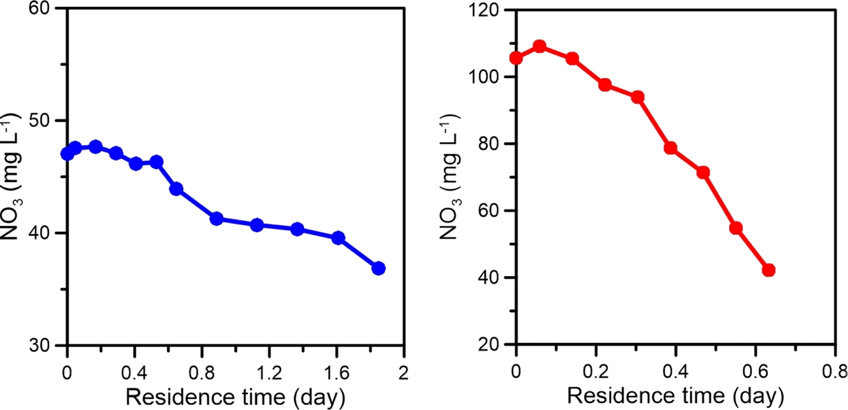 Fig. 4는 두 칼럼에서 분석된 NO3- 농도 변화를 보여준다. Old 칼럼은 1.85일 체류시간 동안 유입수 질산염 농도의 약 22%, New 칼럼은 0.63일 체류시간 동안 유입수 질산염 농도의 약 60%가 제거되었다. 특히 New 칼럼은 Old 칼럼에 비해 확연하게 많은 제거가 이루어졌는데, 이는 두 칼럼의 운용 기간에 따른 질산염 제거 효율 차이 때문인 것으로 판단된다.