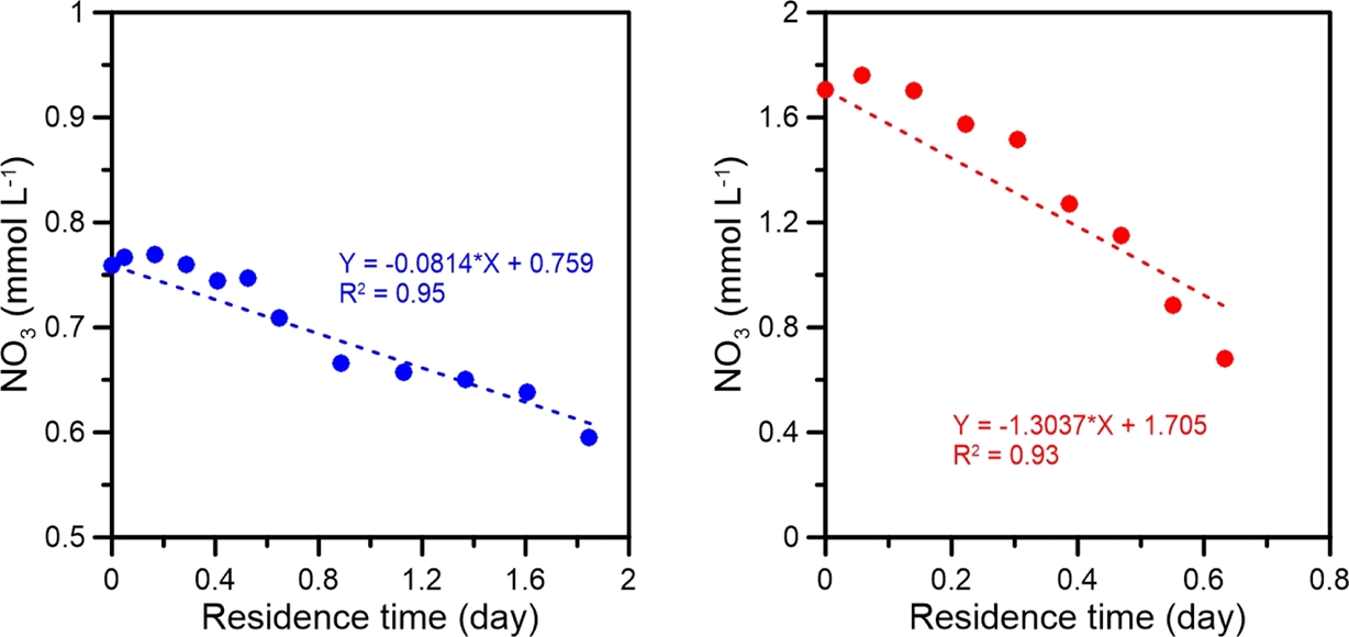 두 칼럼에서의 반응 속도를 비교하기 위하여 NO3-의 농도를 영차 반응 속도식(zero-order reaction kinetic equation) (식 7)에 적용하여 반응 속도를 계산하였다. 일반적으로 영차 반응에서는 반응 속도가 기질의 농도와 무관하며, 농도와 시간의 관계는 직선으로 나타난다. 탈질 반응 속도는 NO3-의 농도가 약 22.2 mg L-1 이상일 때 영차 반응을 따르는 것으로 보고된다(Dincer and Kargý, 2000).