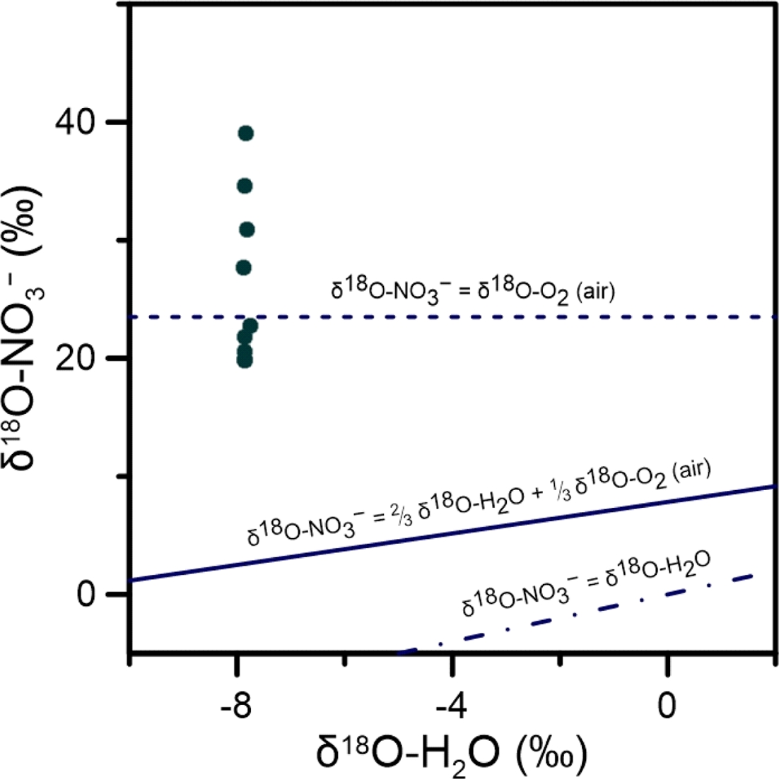 Fig. 9 δ18O-NO3 − vs. δ18O-H2O in the New column with theoretical values. The dashed line represents the oxygen isotope composition of nitrate in which all oxygen atoms are derived from atmospheric O2. The solid line indicates that one-third of the oxygen is derived from O2, while two-thirds originates from H2O. The dash-dotted line indicates that all oxygen atoms are derived from H2O (Ren et al., 2021). |
